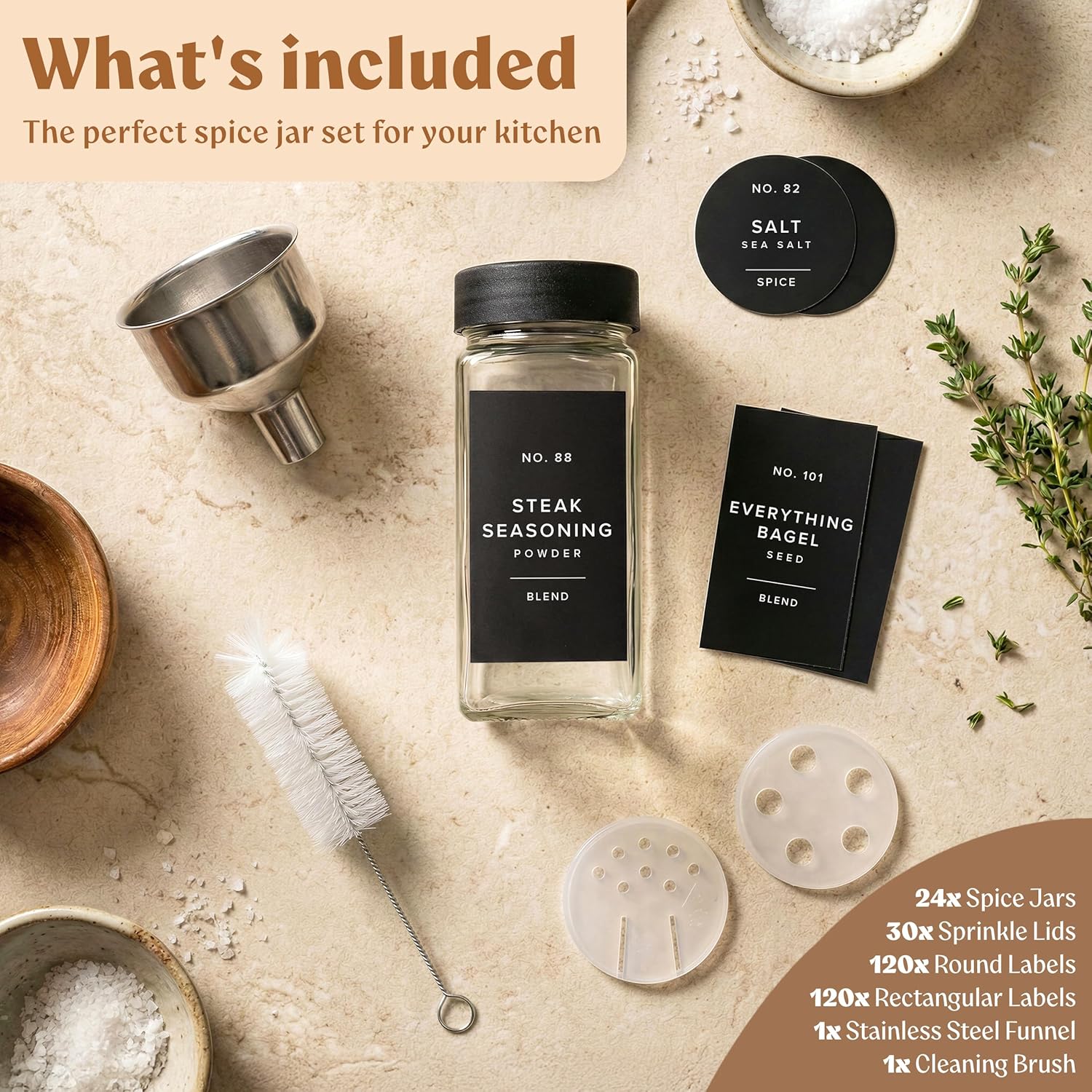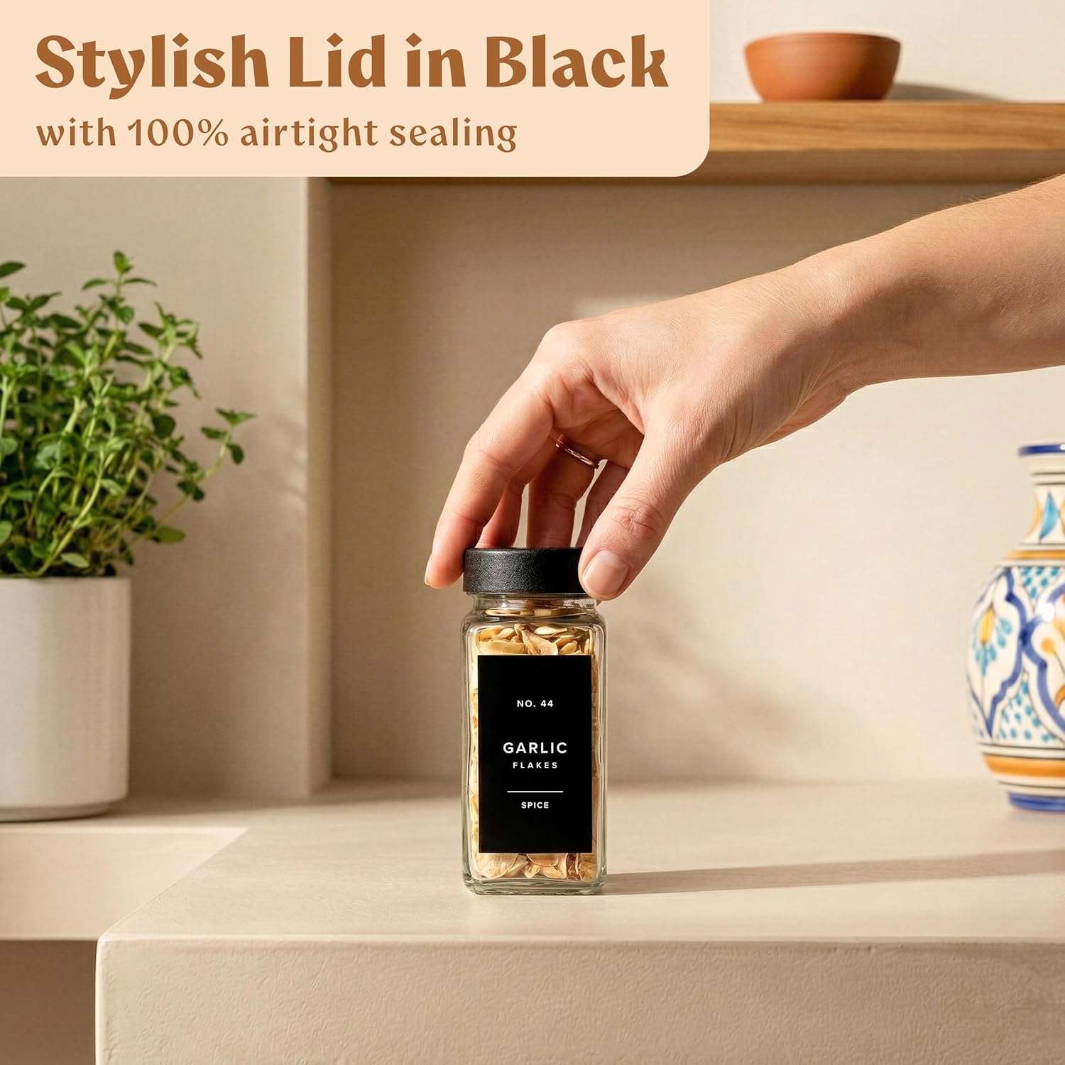 Glass Spice Jars with Labels (24 x 4oz) Spice Containers with 240 Labels, Shaker Inserts, Funnel, Empty Square Empty Square Seasoning Organizer (Black Lids)