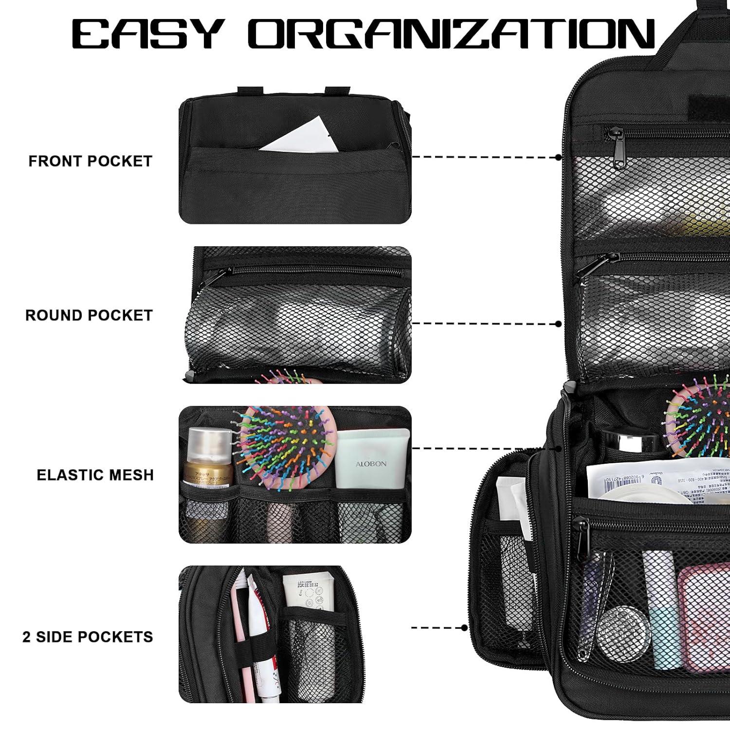 Never Lose Items Again:Stay perfectly organized on the go with 10 dedicated compartments. This hanging bag neatly stores all your cosmetics, toiletries, and essentials, making everything easy to find and access in an instant