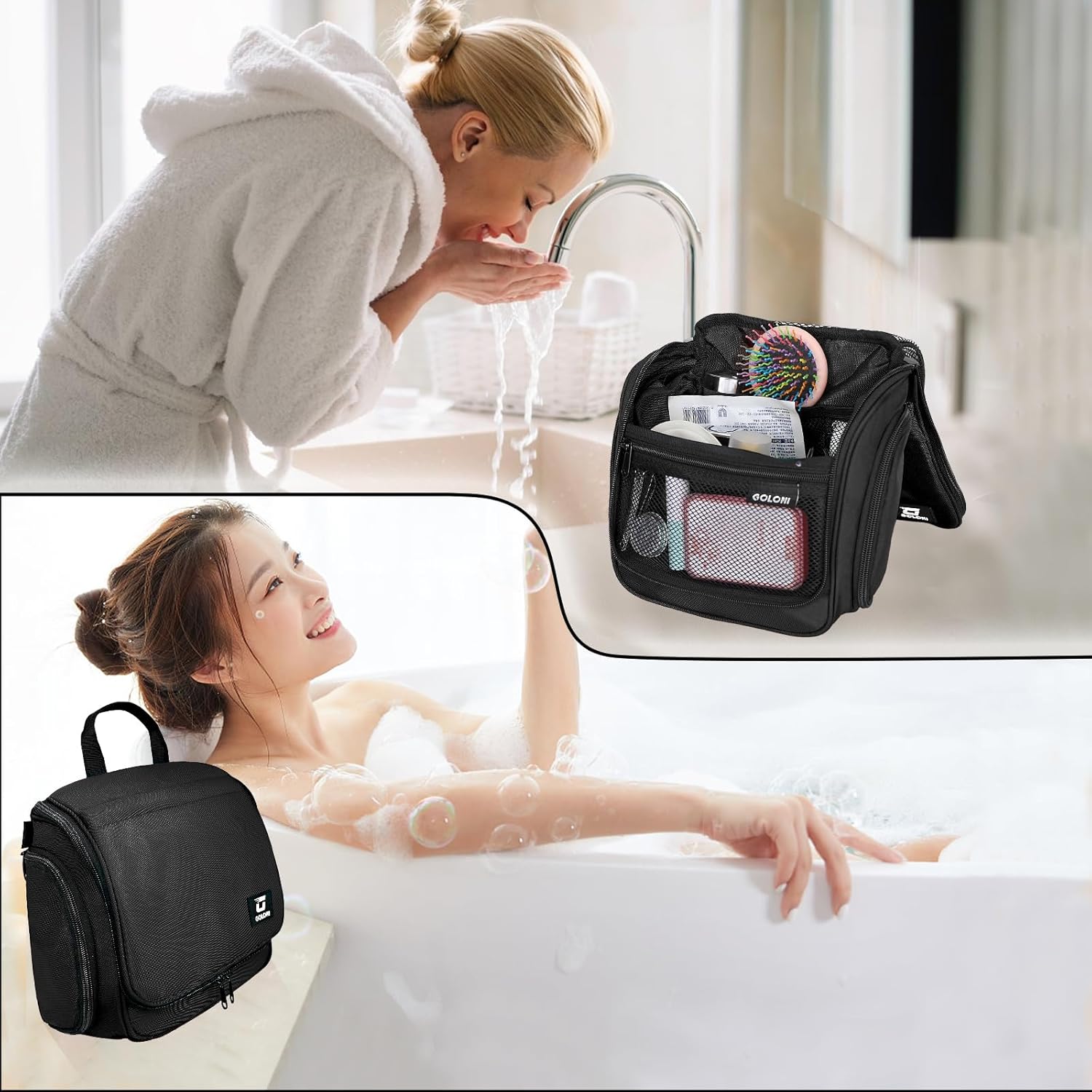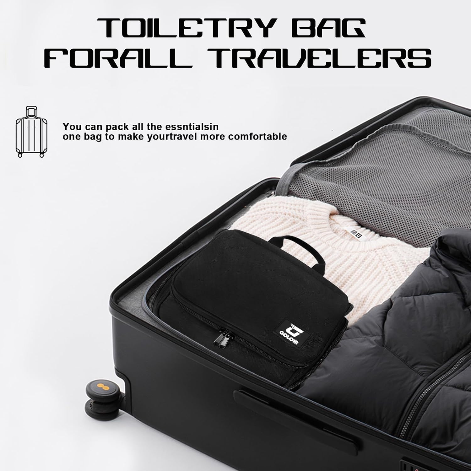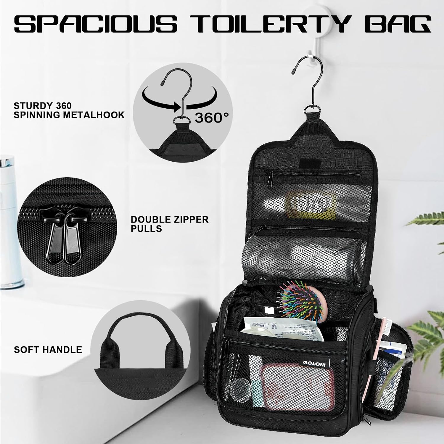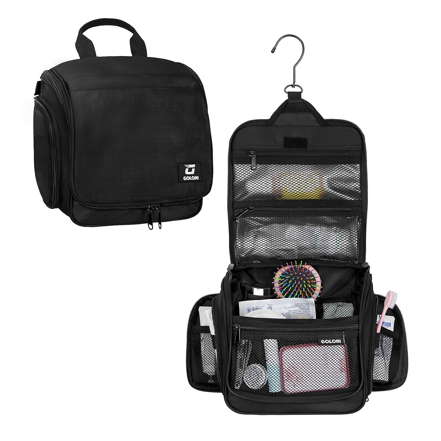 Goloni Hanging Toiletry Bag with Hook, Large Makeup Bag Travel Organizer, Water-Resistant Hanging Cosmetic Bag with 10 Compartments for Women & Men,Black