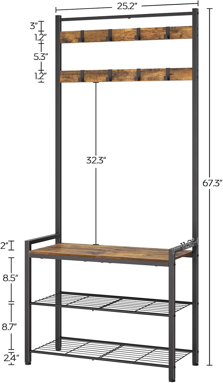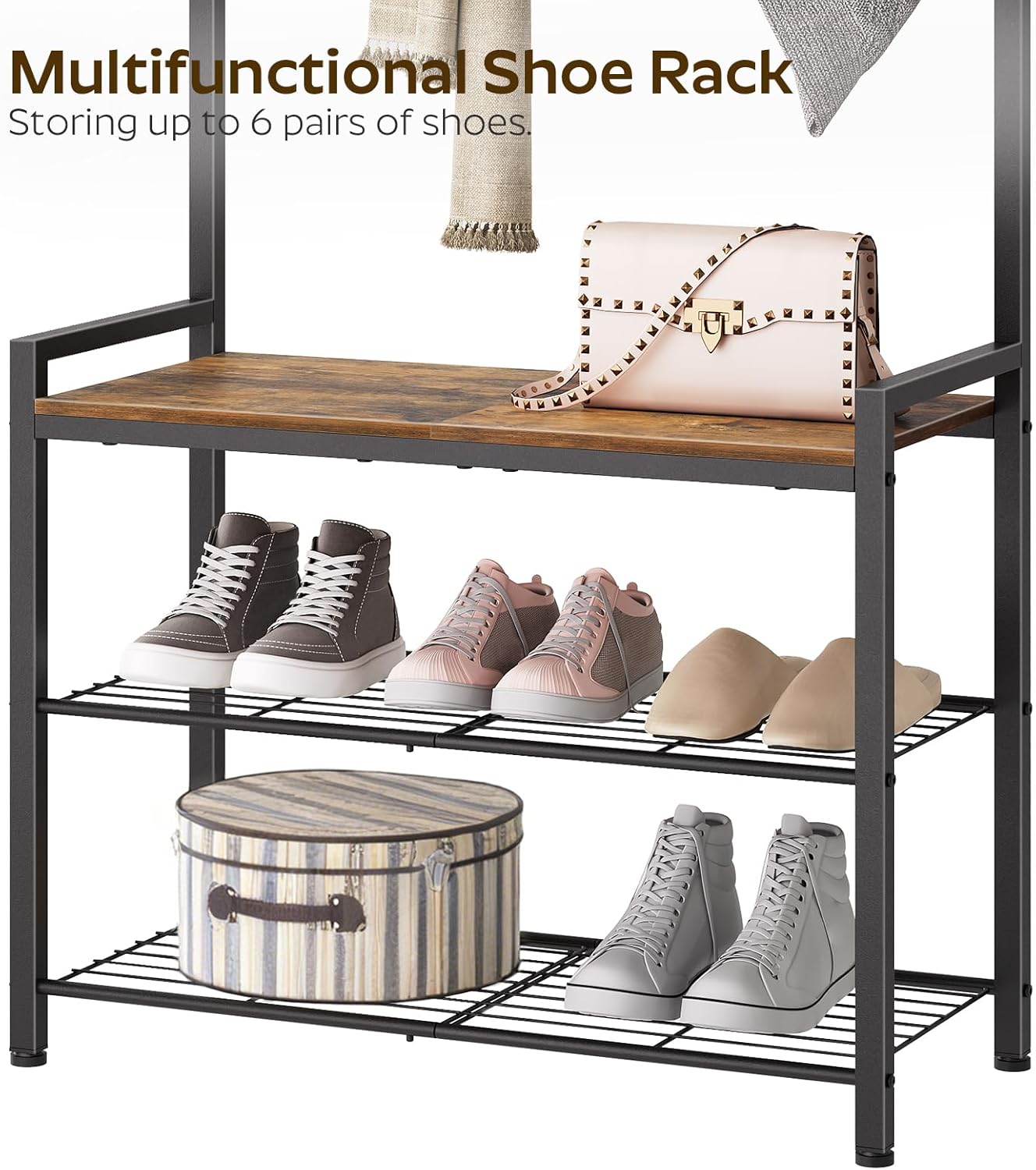 Hall Tree, Coat Rack with Shoe Bench, Entryway Bench with Shoe Storage, Multifunctional Entryway Storage Organizer, Metal Frame and 8 Movable Hooks, for Hallway, Rustic Brown MT01BR