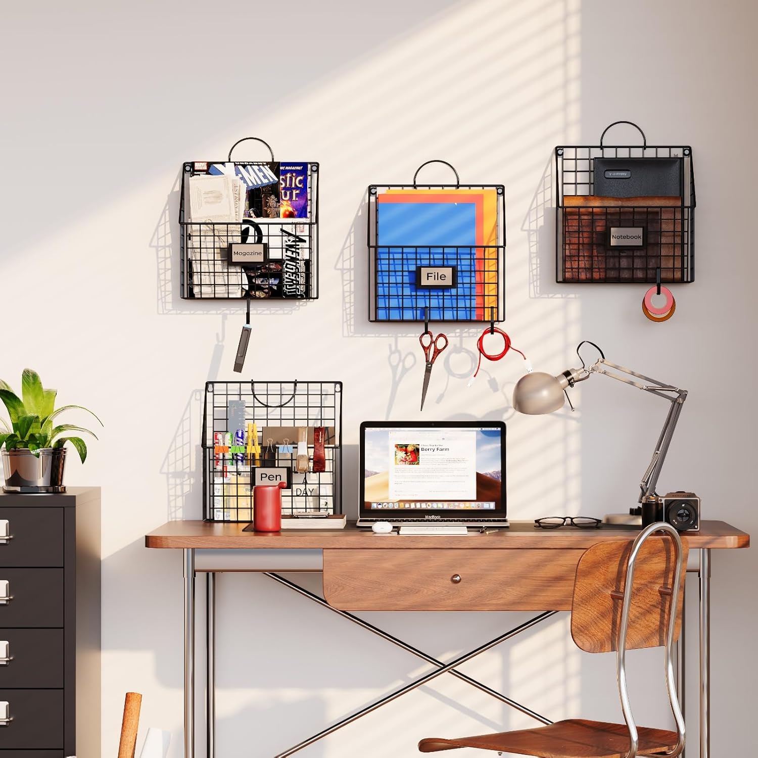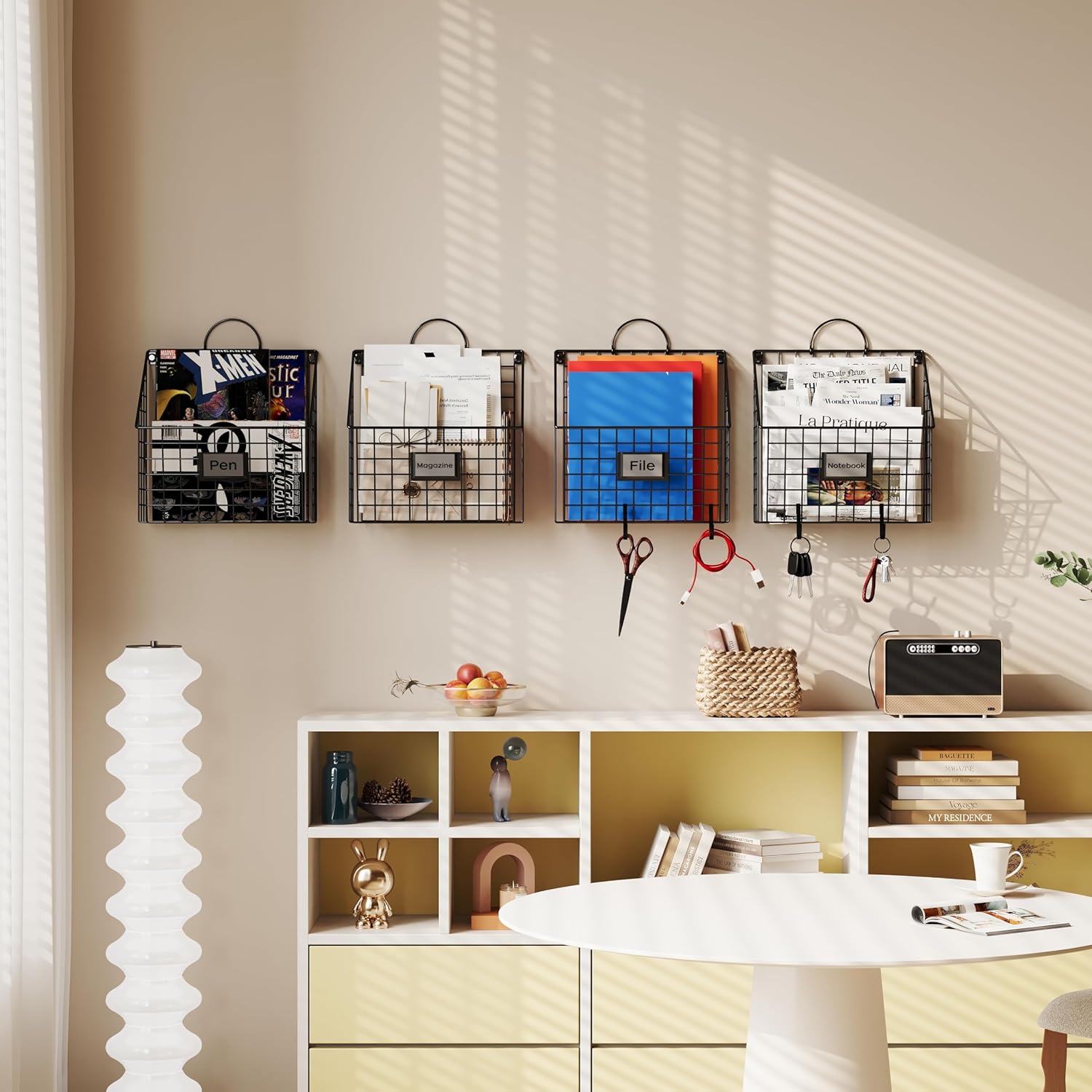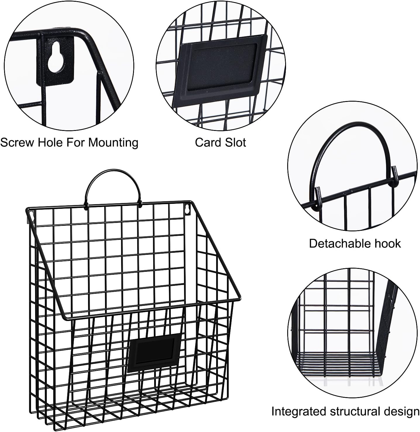 The 4 hanging file holders come with 4 handles, 4 adhesive wall hooks and 4 hooks for hanging items.The file organizer can be wall mounted, hung on wall or placed on desk top. Its movable handle can be put down if not in use. You can use the 4 organizers to store letters, file folders, newspapers , magazines, photo frames, decors and etc. We also give you 4 writable cards to put in the card slots to distinguish different storage baskets.