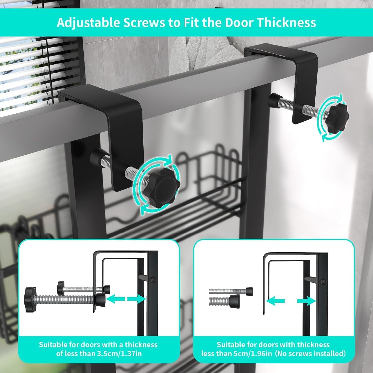 [Size & Warm tip]: The full length of this over the door shower caddy is 33.26 inches, and the load-bearing hooks of our shower organizer hanging have a swivel adjustable design, the maximum width can be adjusted up to 1.96 inches(No screws installed)
