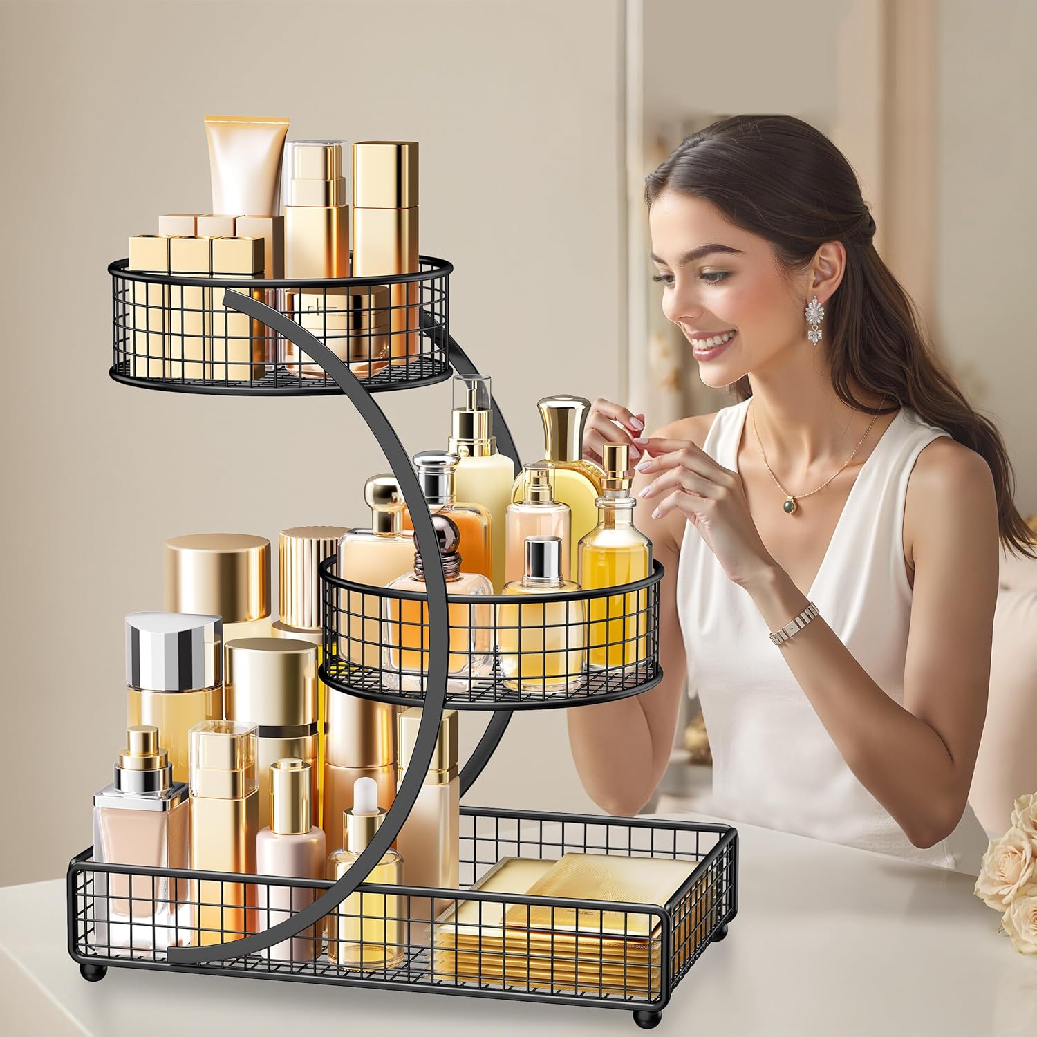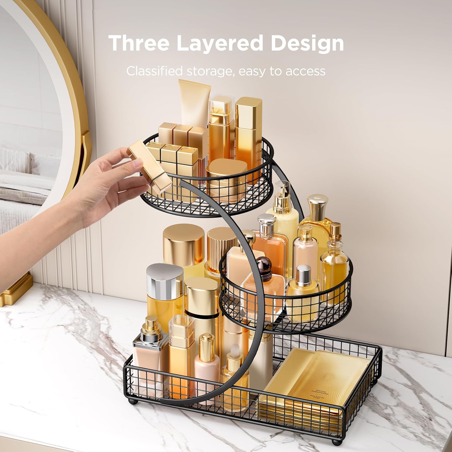 Sturdy and Classy: Made of premium metal (no plastic), the makeup holder organizer is durable and easy to clean, rust-proof and water-proof. Bottom with 4 stable feet to keep organizer off the countertop.This 3 tier versatile counter shelf organizer can be placed in the kitchen, bathroom, bedroom or dressing room vanity top.