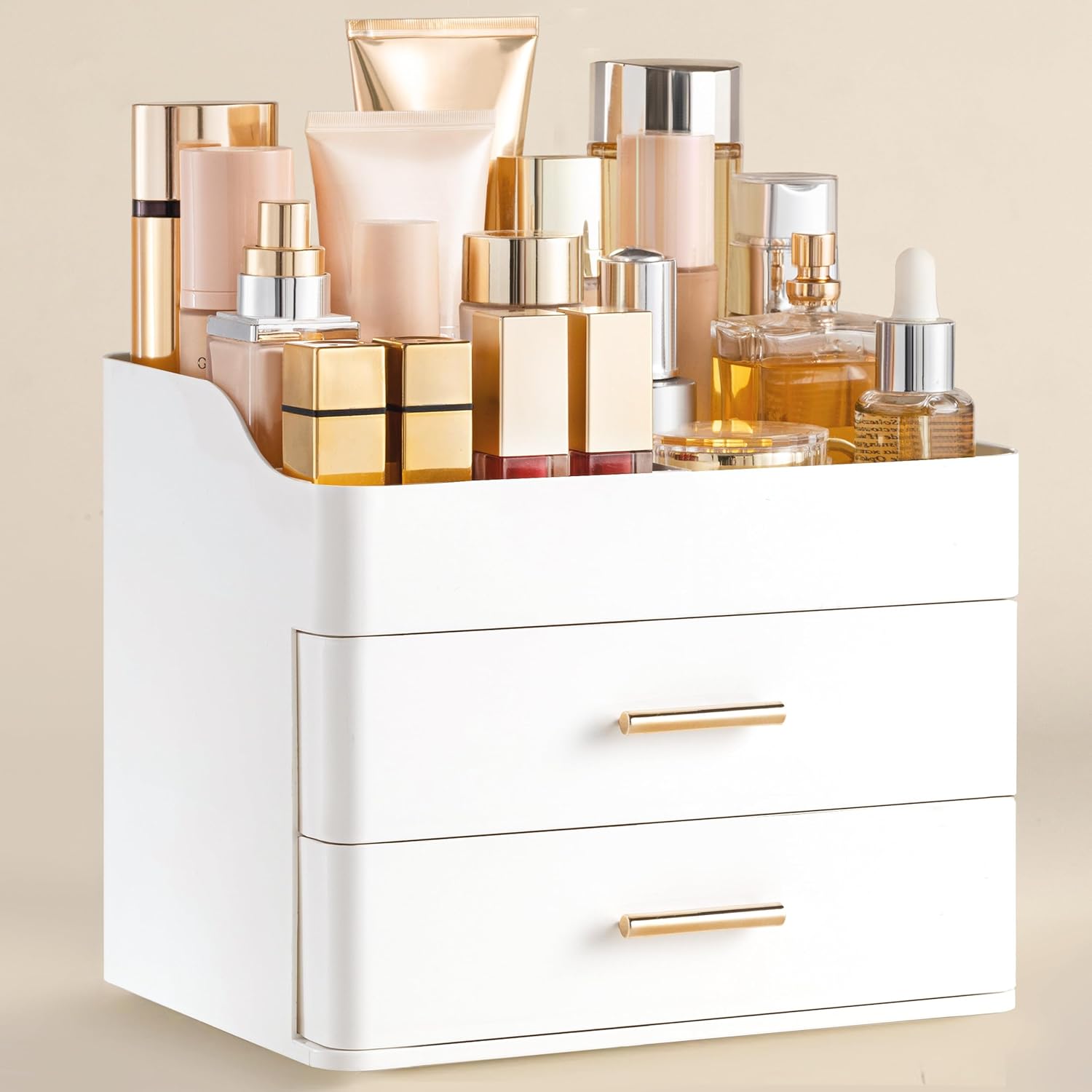 HBlife Makeup Organizer for Vanity with 2 Drawers, Large Bathroom Countertop Cosmetics Organizer Skin Care Storage, Easy to Store Lipsticks, Nail Polishes, Perfumes, Eyeshadow Palettes, All White