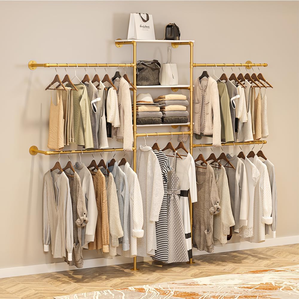 Heavy Duty Gold Pipe Clothing Rack – Wall Mounted Industrial Clothes Rack, DIY Corner Closet System with Shelves, Adjustable Walk-in Closet Organizer (GOLD, 94.5″)