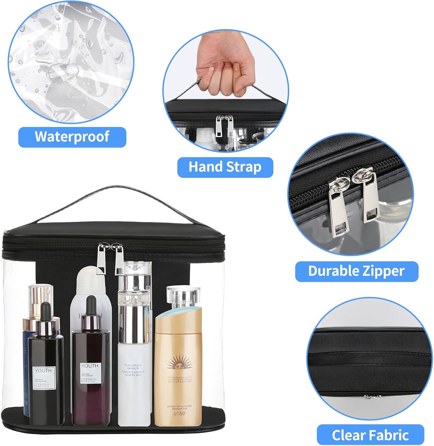 Heavy Duty Leak Proof Clear Travel Bags for Toiletries, Transparent Makeup Cosmetic Bag with Zipper and Handle (Large, Black)