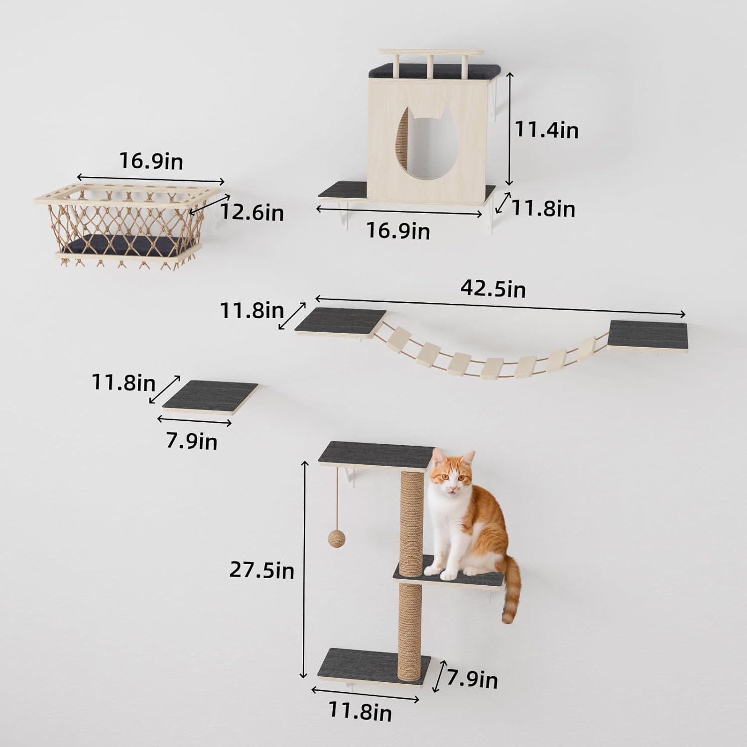 HHOFURN 5-in-1 Cat Wall Shelves Set with Hammock, Wall-Mounted Cat Furniture Includes Condo, Bridge, Ladder & Steps for Indoor Cats, Safe & Stable (Gray)