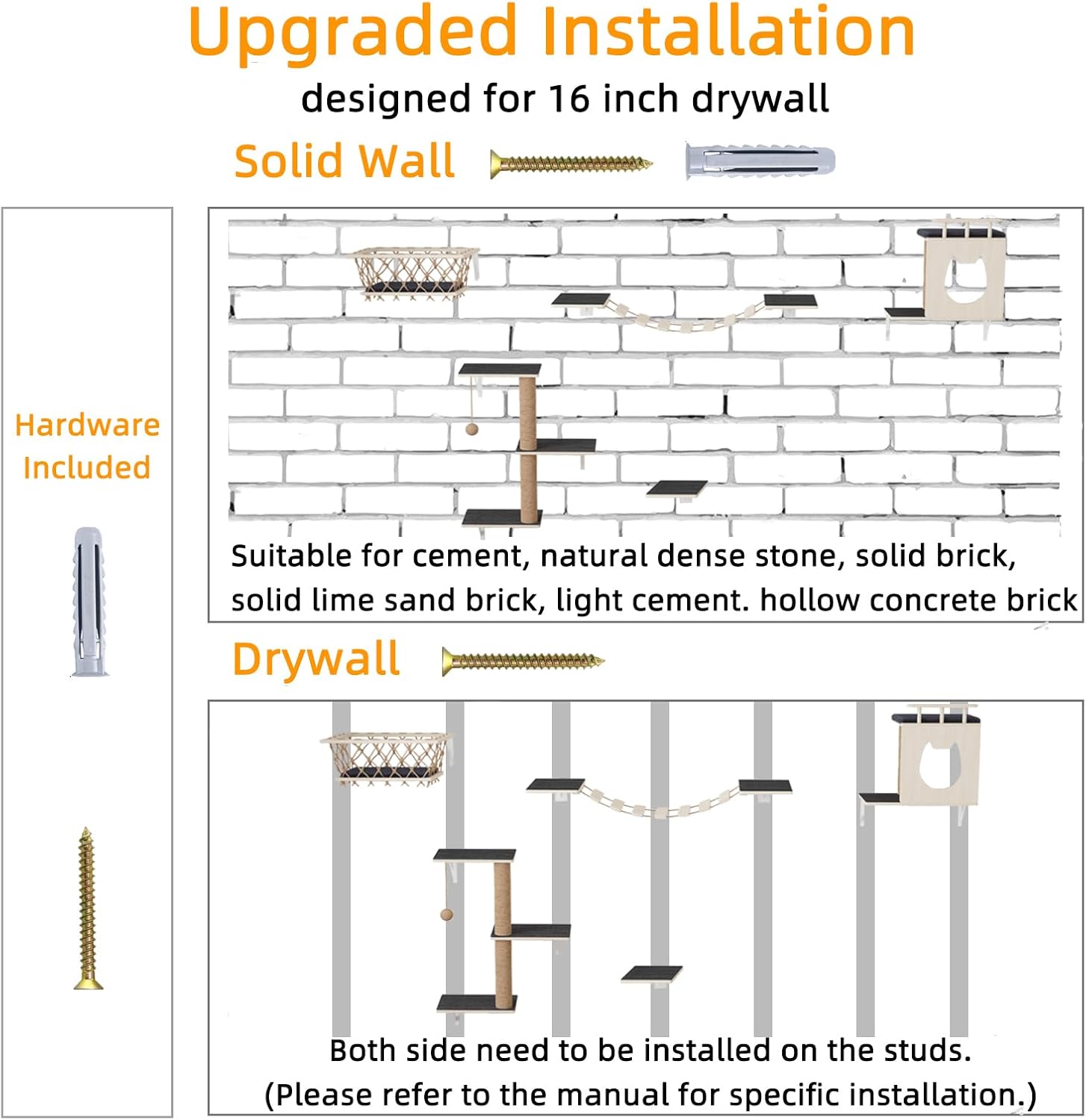 【Rock-Solid & Safe】Crafted from solid wood multi-layer boards and reinforced with triangular steel brackets, this set is built for ultimate stability. Professionally load-tested, each shelf holds over 48lbs, making it perfect for large breed cats or the dynamic play of multiple cats simultaneously. Enjoy complete peace of mind