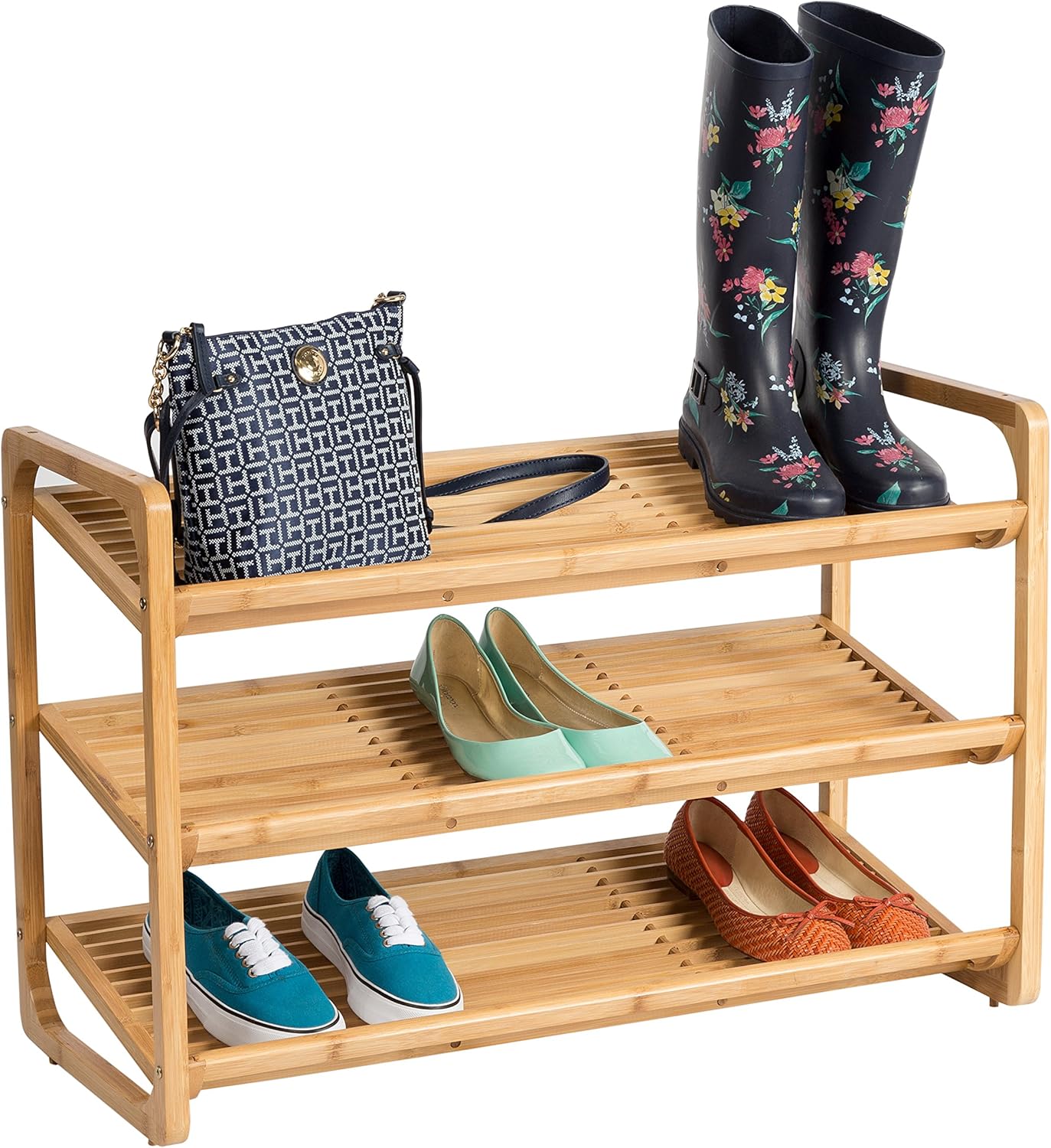 Honey-Can-Do SHO-01599 Deluxe Bamboo Shoe Shelf, 3-Tier. 3-tier shelf for shoes; approximately 3 feet wide; less than 2 feet high. Made from fast-growing bamboo for reduced environmental impact. Slatted surface is attractive, durable, and naturally moisture resistant. Holds approximately 9 to 12 pairs of adult-size shoes. Wipes clean; easy to assemble; available in 2-tier and 3-tier models.