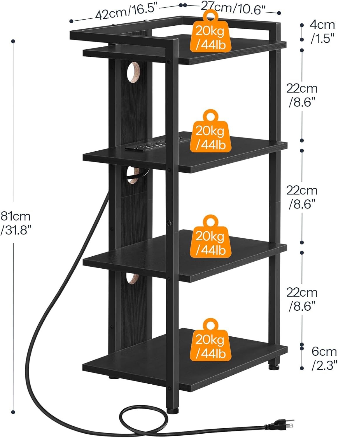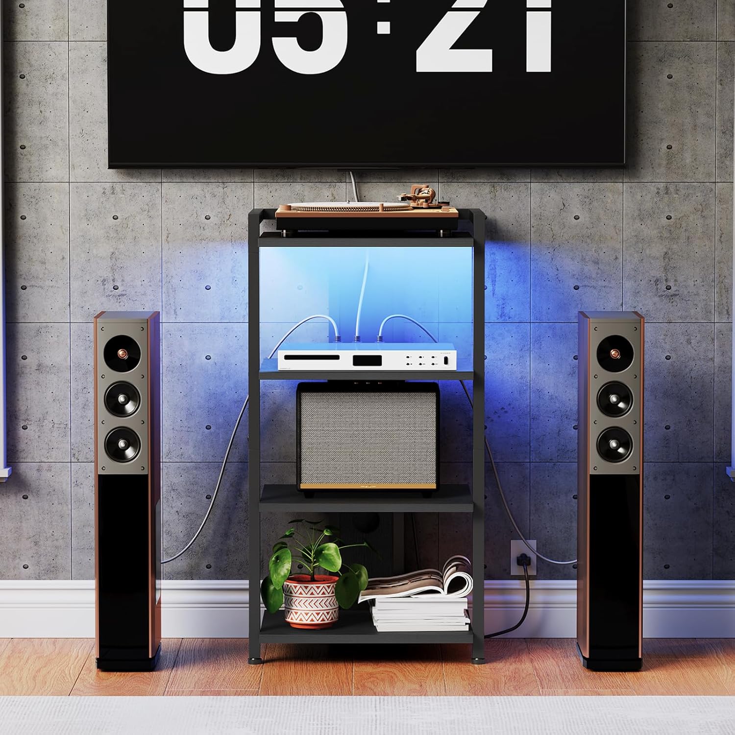 HOOBRO 4-Tier AV Media Stand with Charging Station and LED Light, Wooden Stereo Stand, Rack Audio Tower, Corner TV Stand, Entertainment Device, Black BB38UDCJ01
