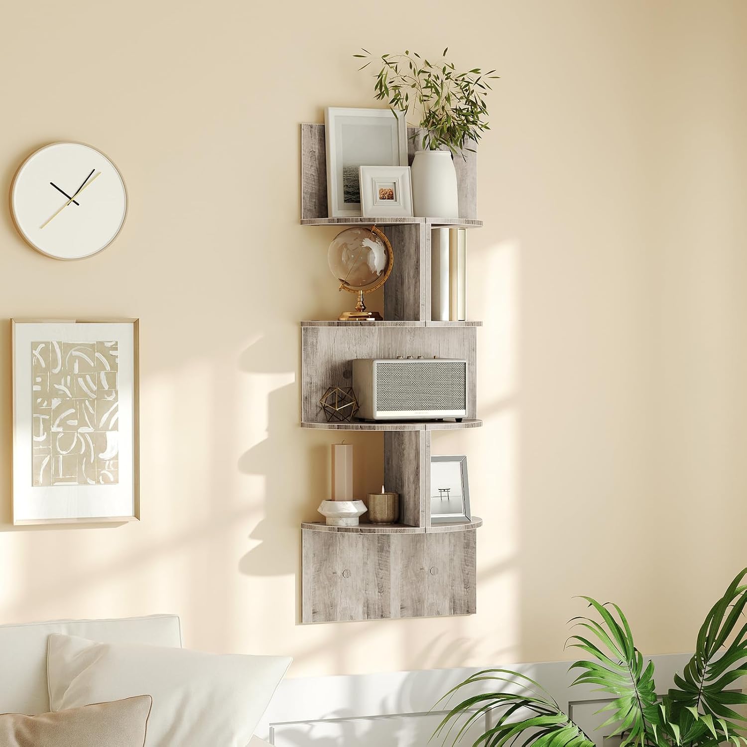 Retro Style with Modern Functionality: This set of 2 floating corner shelves wall mounted incorporates a zigzag design with curved shelves, exuding a strong rustic charm. This corner shelves for wall is a decorative and practical storage solution that adds a unique touch to your living room or office