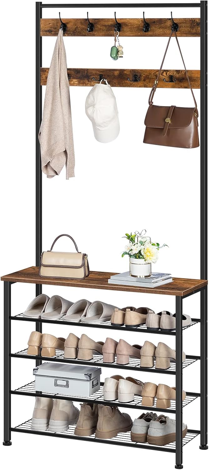 HOOBRO Hall Tree, Coat Rack with Shoe Rack, Hall Tree with Bench, 5 Tier Shoe Storage Organizer with 9 Hooks for Entryway, Closet, Sturdy, Industrial, Rustic Brown and Black BF80MT01G2