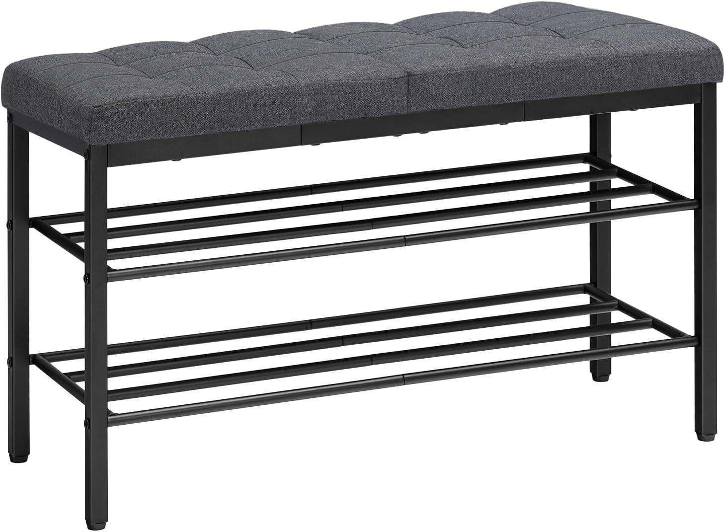 Color: Dark Gray, Black Material: Particleboard, Metal, Sponge, Linen Product Size: 29.5″L x 12″W x 18.1″H Max. Static Load Capacity: Top: 200 lb, Each Metal Shelf: 22 lb Package Contents: 1 x Shoe Bench; 1 x Accessory Kit; 1 x Instructions HOOBRO Notes: The soft cushion is not allowed to be immersed in water. Please position the product away from the fire source.