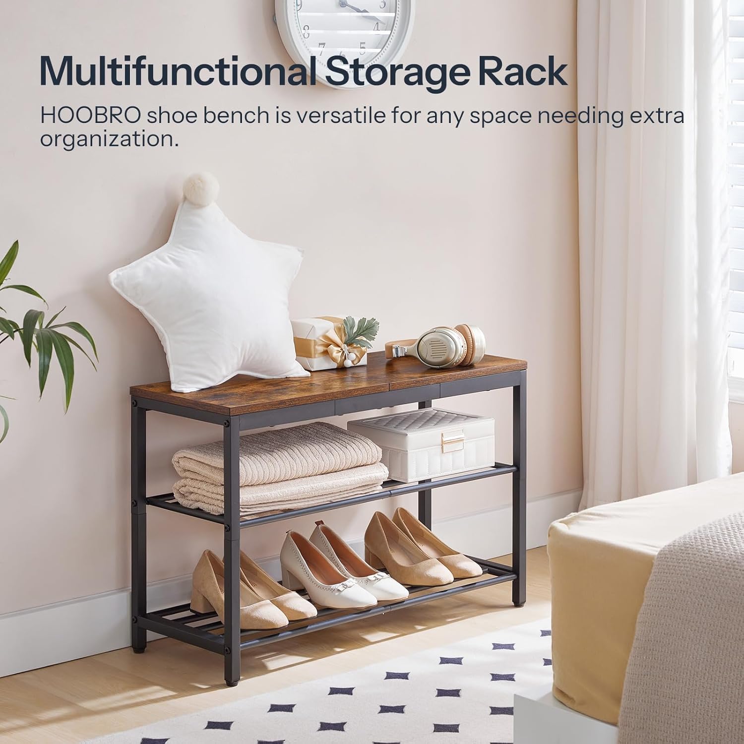 HOOBRO Shoe Storage Bench, 29.5″ L Entryway Bench Organizer, 3-Tier Shoe Rack for Closet, Shoe Shelf with Wooden Top Seat, Loads 300 lb, Space-Saving, Rustic Brown and Black BF76HX01