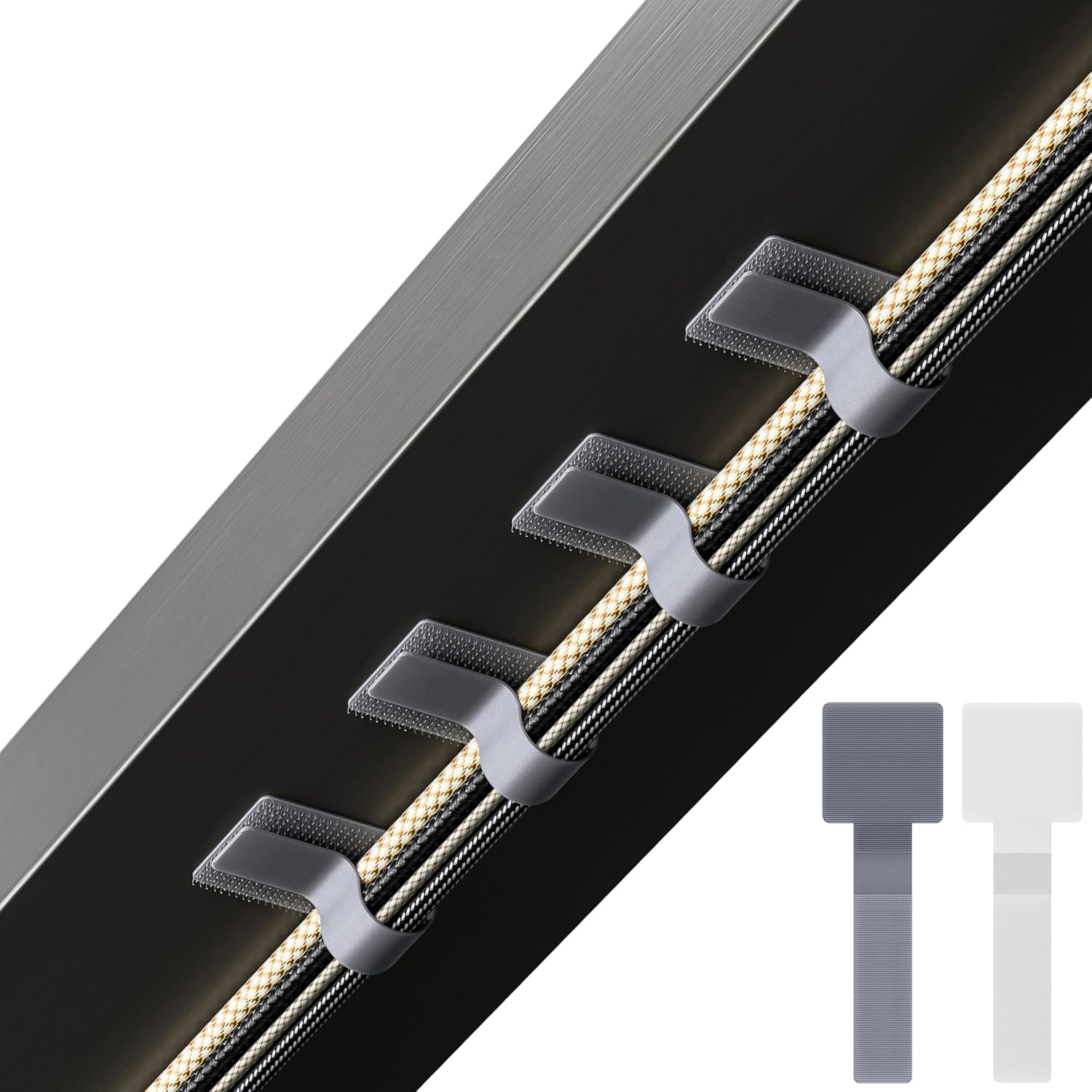 Flexible Cable Management: A set of 40 self-adhesive hook and loop cable ties for organizing cords and wires in the office, home, kitchen, or workshop. Bundling cables with these ties helps declutter and maximize space. They are lightweight and easy to use without any tools or experience required. Additionally, they are flexible and can be applied to curved surfaces.