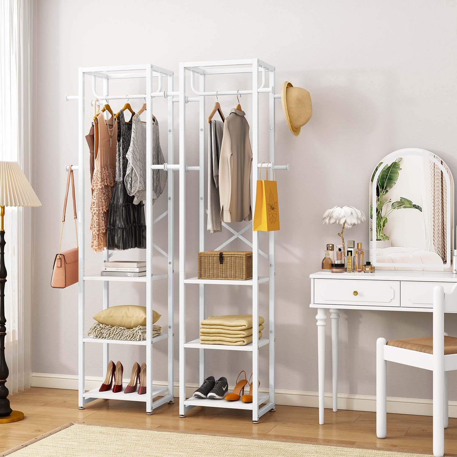【3-in-1 Coat Rack】IBUYKE multifunction coat rack features 3 shelves perfect for shoes, bags and everyday essentials, but also 8 hooks and hanging rods to give you an extra handy place for coats, hats, scarves or totes.