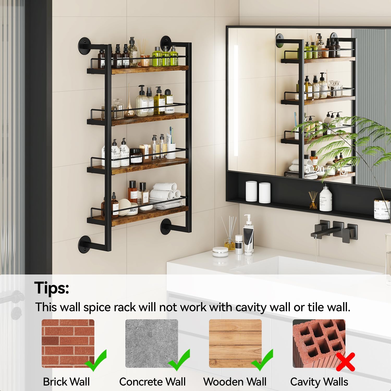 The wall spice rack is made of premium quality particle board can efficiently resist the corruption from water and easy to be cleaned.