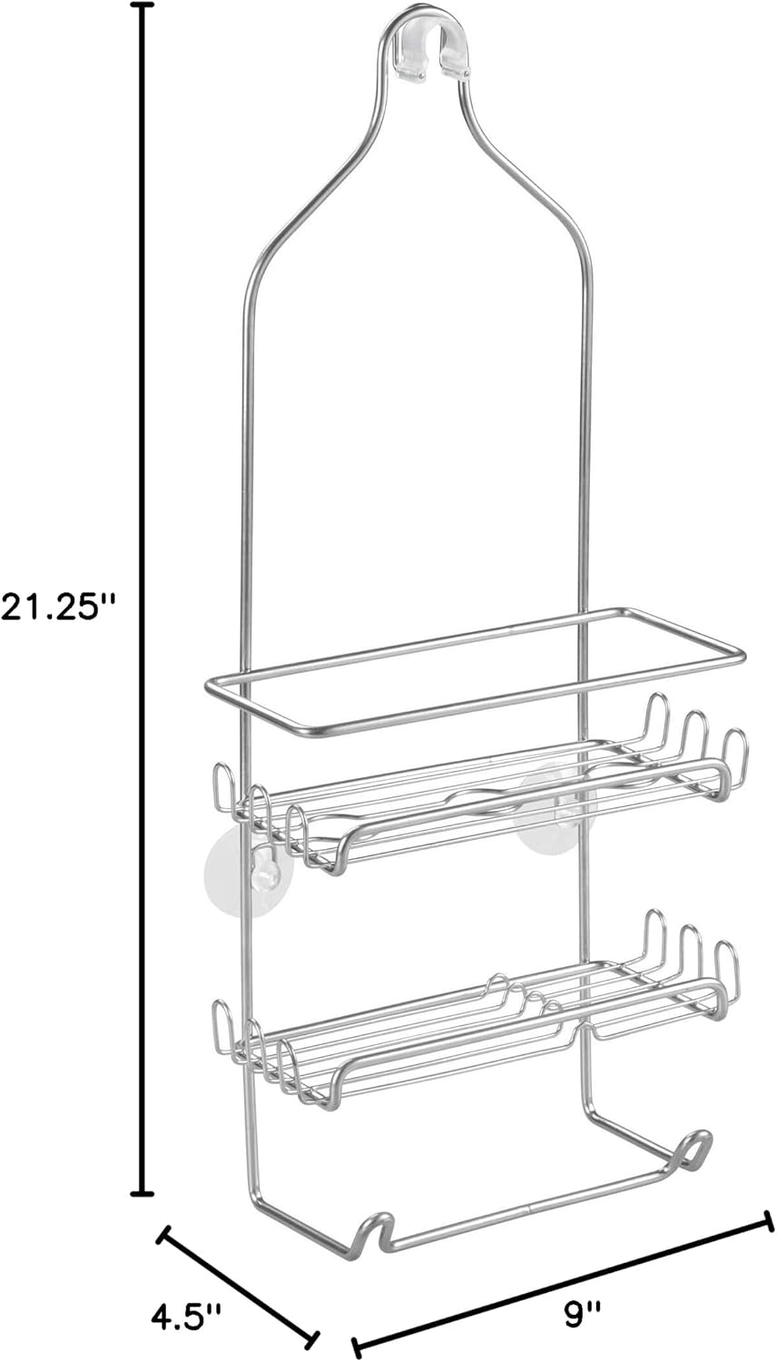 Upgrade your bathroom storage with the iDesign Milo Collection Hanging Shower Caddy. This all-in-one shower organizer features two storage shelves, a towel rack, and fourteen hanging hooks to keep bathroom necessities such as shampoo and conditioner bottles, shower gel, bar soap, toothbrushes, toothpaste, razors, sponges, loofahs, washcloths, and more within reach in the shower or bathtub. The innovative top shelf of the shower caddy organizer securely holds three bottles upside down to help you use every drop of your hair and body care products. The open wire design of this bathroom organizer provides proper airflow and allows items to dry more efficiently after use, while the two integrated suction cups and non-slip grip ensure a secure hold in wet or dry conditions. Simply place the hanging organizer over the top of the showerhead and push the suction cups into place on the wall – no mounting or hardware required! The durable steel construction with rustproof silver finish stands up to everyday use and is easy to clean with mild soap and water. Measuring 9″ x 4.5″ x 21.25″, this shower storage caddy adds instant organization in unused space in the shower. With iDesign, you can live simply every day.