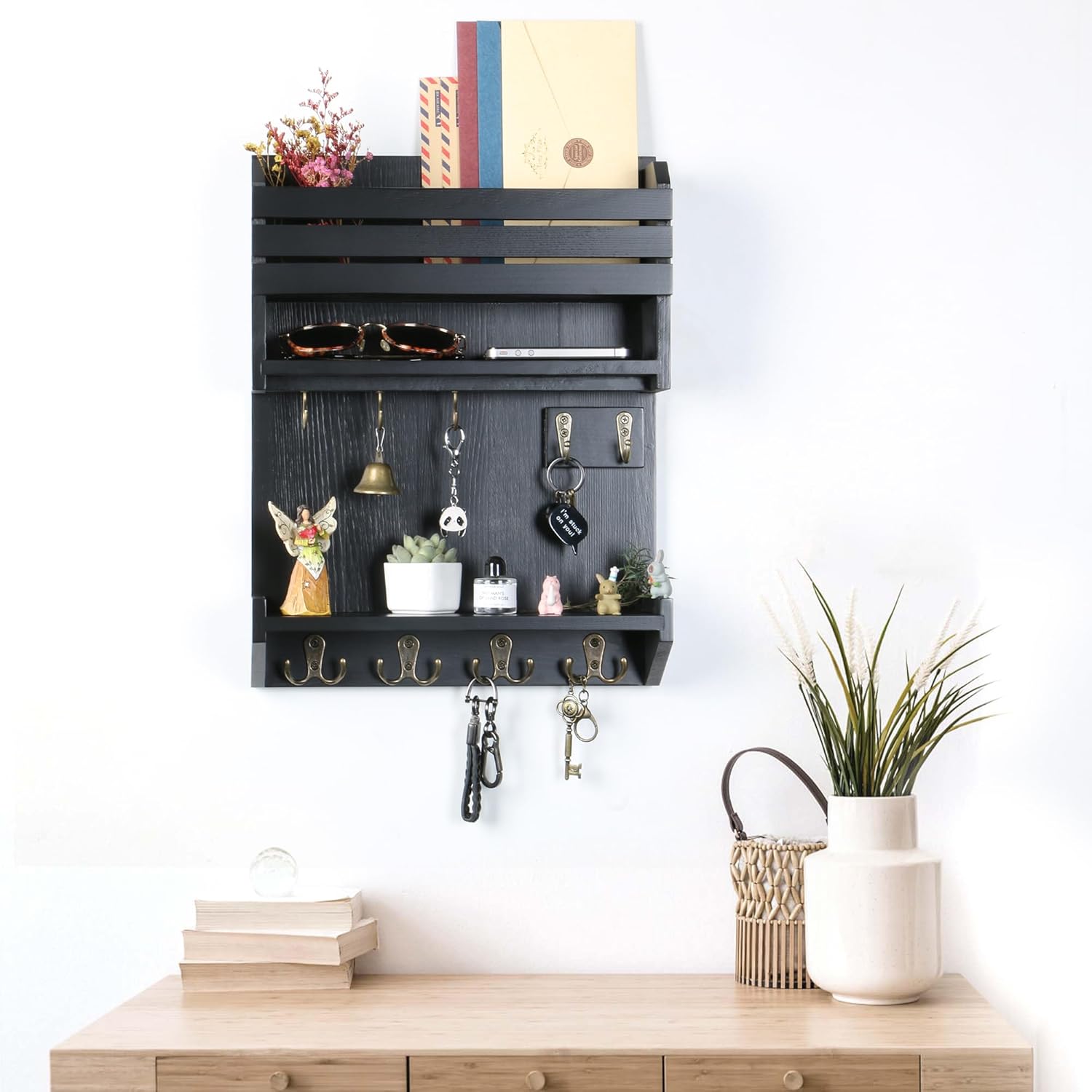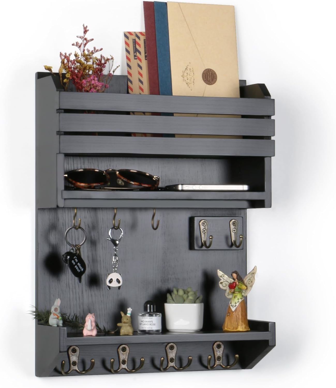 MULTIFUNCTIONAL STORAGE: The key and mail holder make the most of your wall space, it can storage mails, letters, magazines, envelopes and newspapers. The key rack have 9 hooks for hanging keys, umbrellas, hats, dog leashes, sunglasses, etc.
