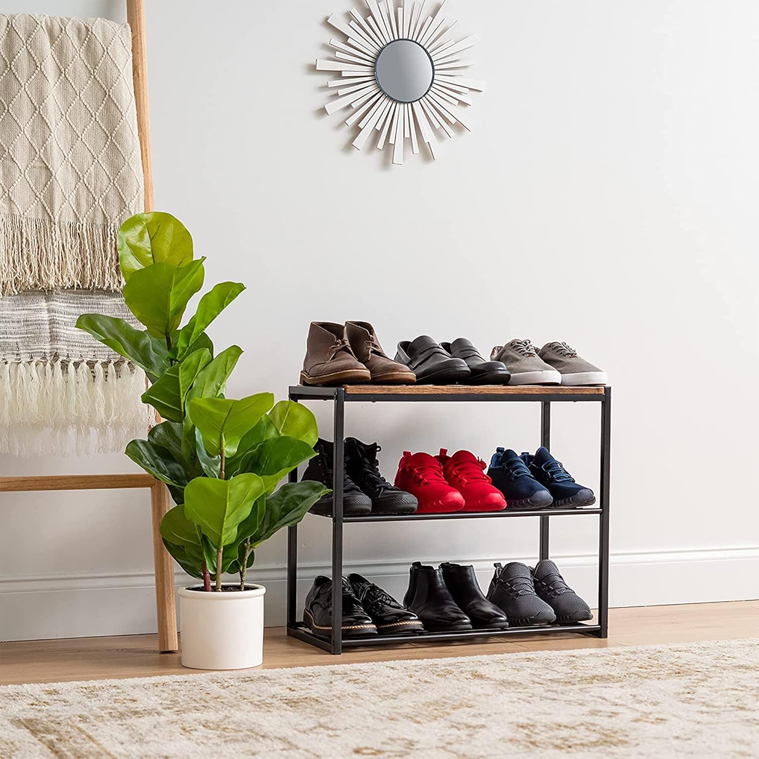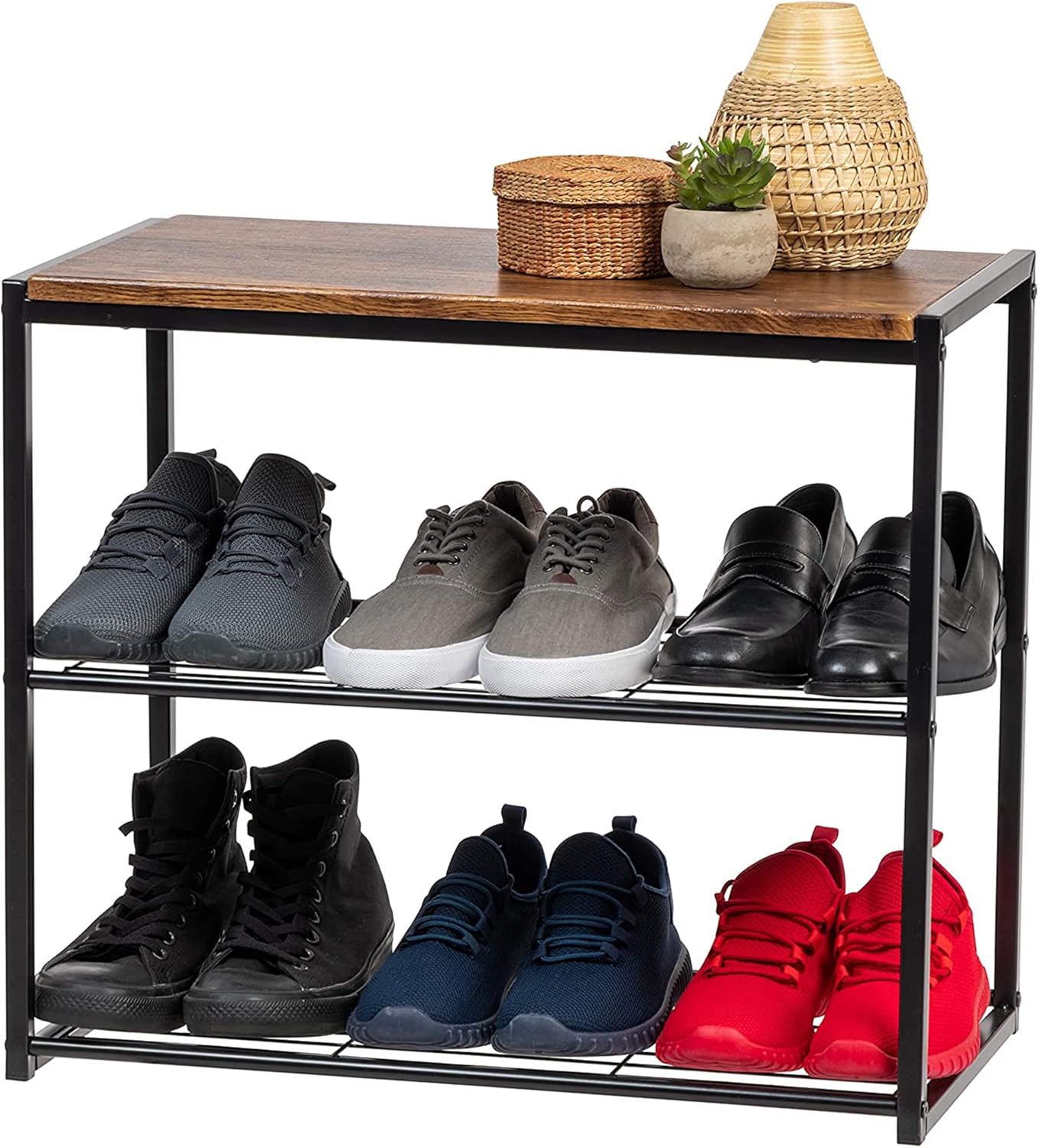 IRIS USA 3-Tier Shoe Rack, Up to 6 Pairs, Shoe Bench for Front Door Entrance, Entryway, Mudroom Bench, Shoe Organizer for Closet, Shoe Storage Shelf, Modern Wood and Metal Shoe Rack Bench