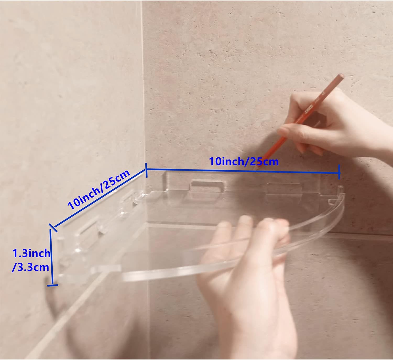 Color: Transparent Main Materail: Acrylic Installation Method : Adhesive Wall-MountedPackage Includes: 2 * Corner Shower Shelves + 6 * Adhesives