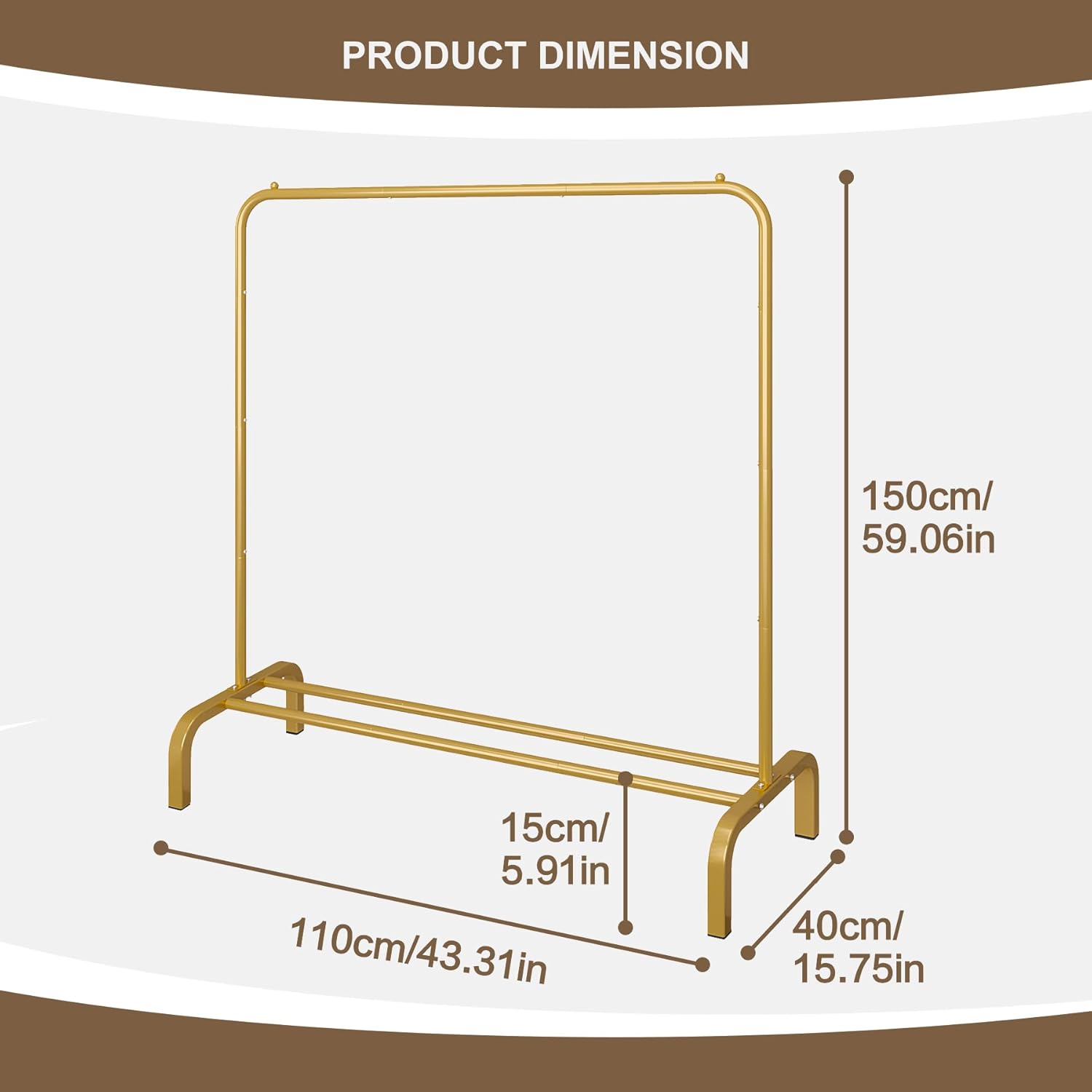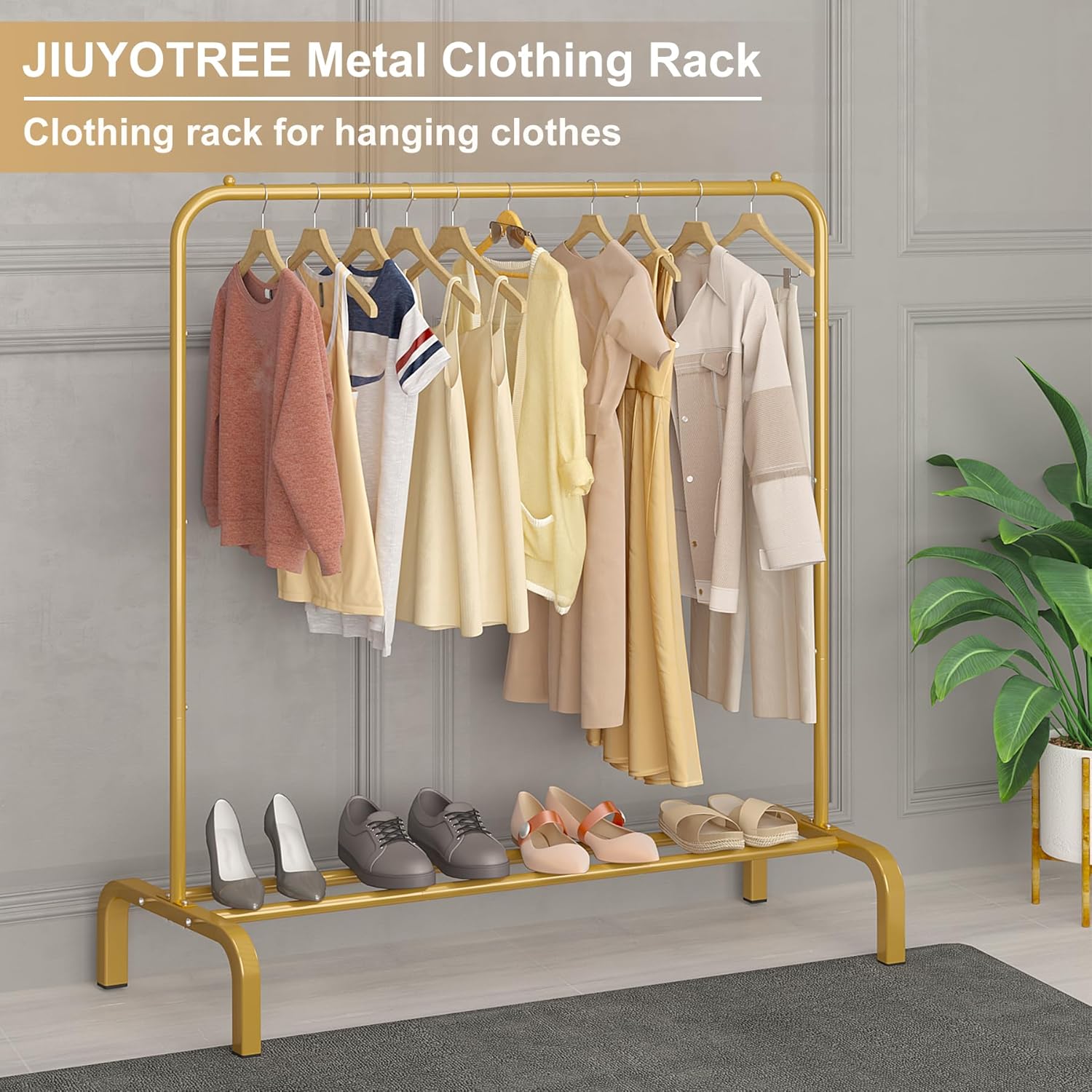 JIUYOTREE Metal 43.3 Inches Garment Rack with Bottom Shelf Clothing Rack for Hanging Clothes Coats Skirts Shirts Sweaters Gold