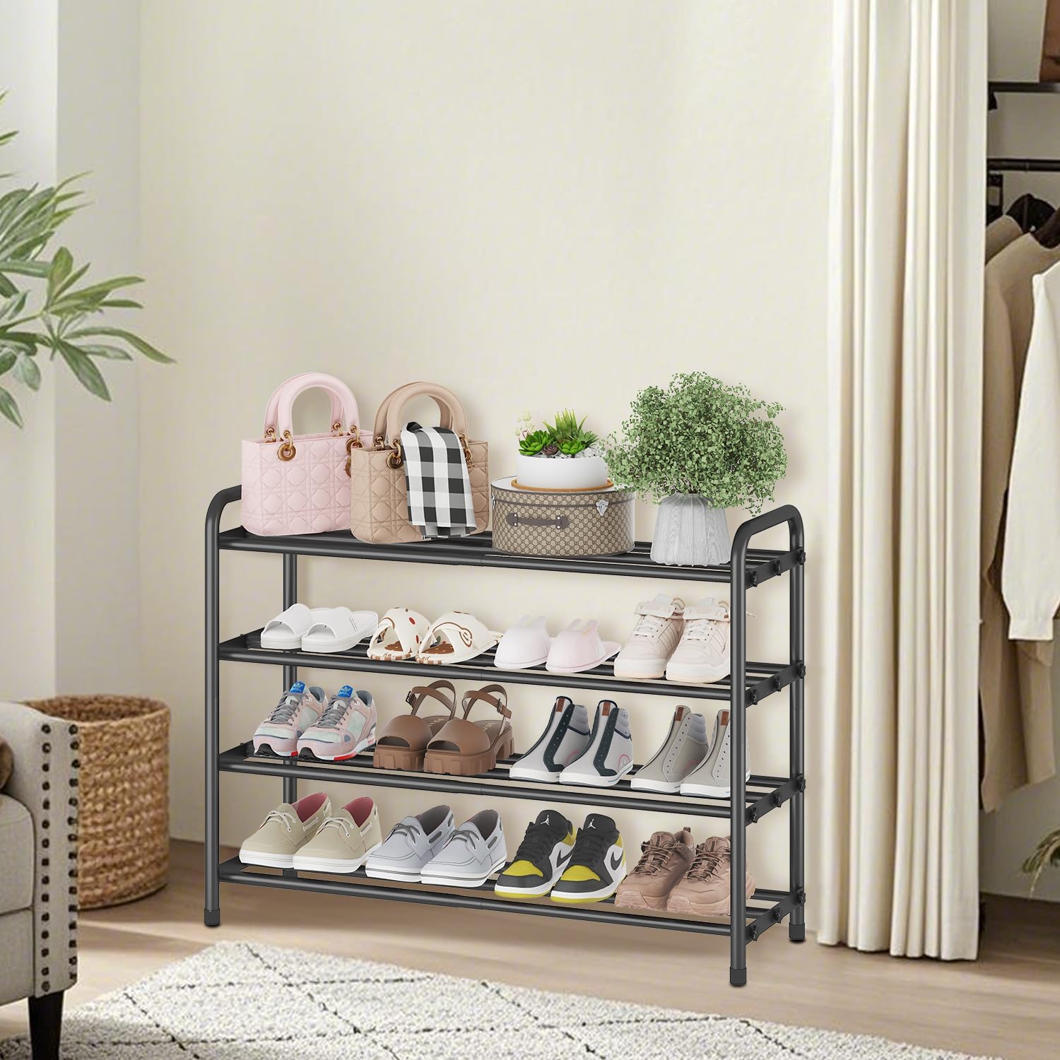 Not at all! The sleek matte black finish suits modern, farmhouse, or industrial styles. Use it as a shoe rack for entryway, bedroom, or closet shoe rack—it’s both functional and stylish!