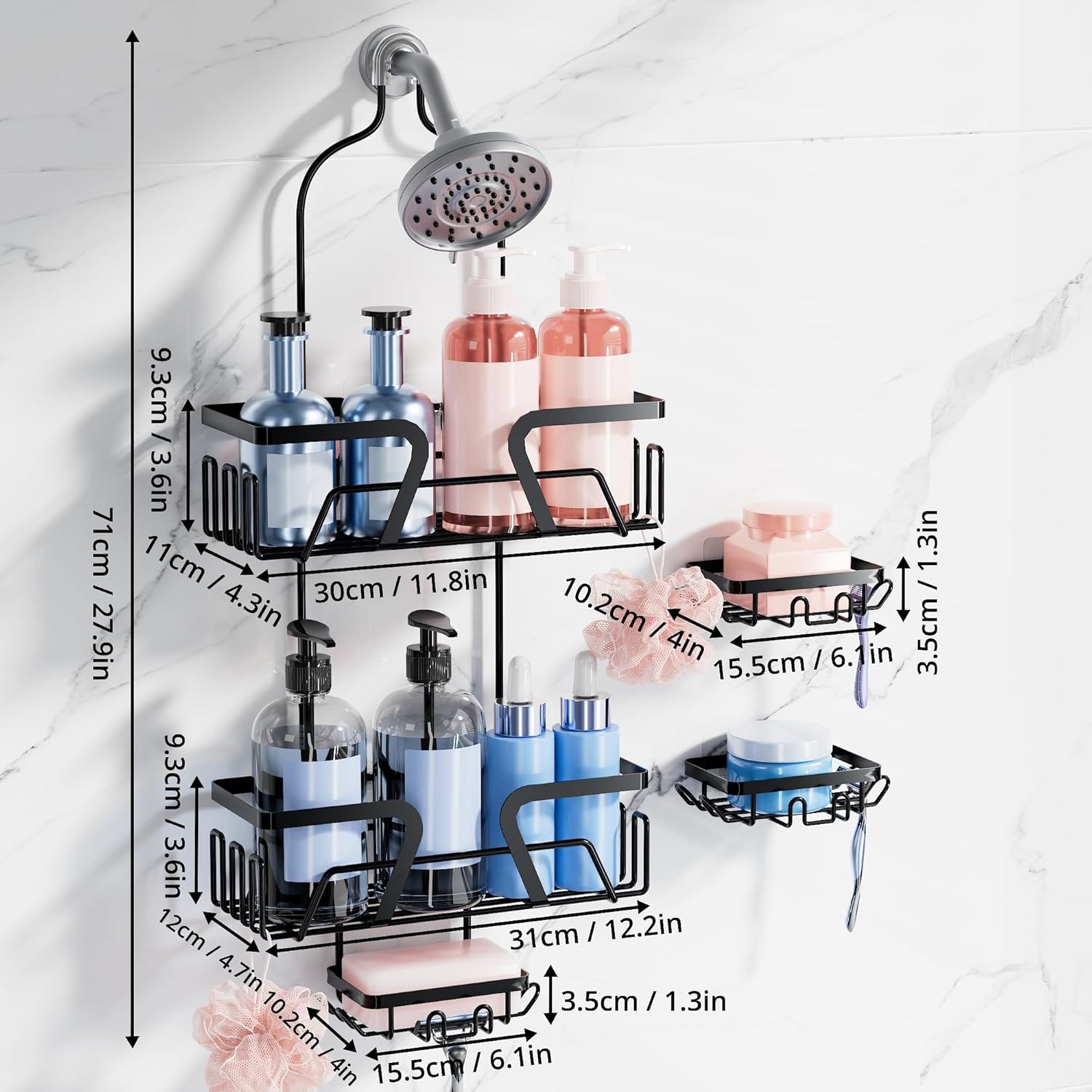 Space-Saving Design — Extra 2 Adhesive Soap Holders:This 3-tier hanging shower caddy features double baskets and 3 soap dishes, including 2 adhesive soap holders with hooks for organized storage of shampoo, conditioner, razors, towels, and more