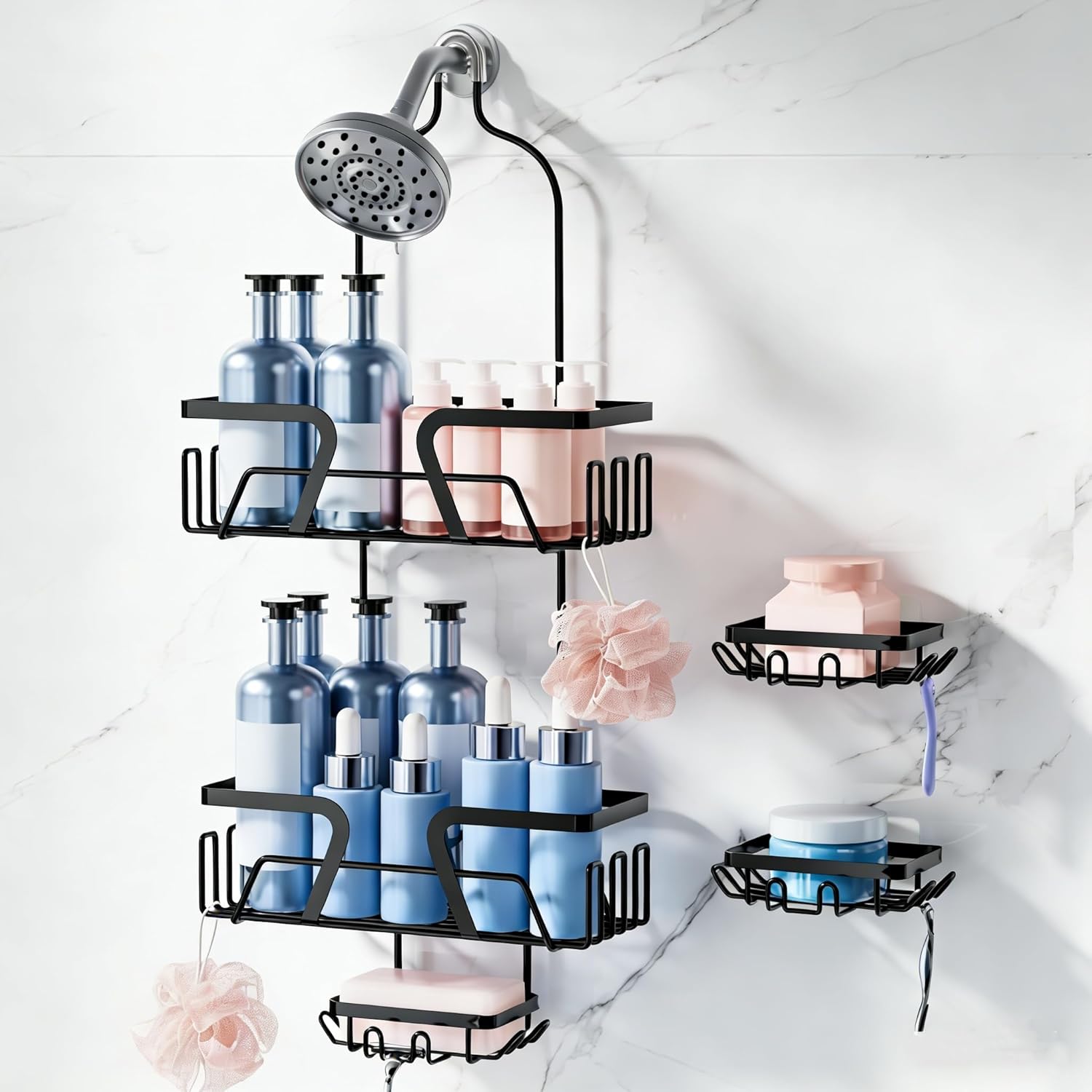 KEGII 3-tier Black Hanging Shower Shelf for Bathroom Organize your bathroom with this 3-tier hanging shower caddy, designed for convenience and style. It features double wire baskets and three soap dishes—two of which are adhesive with hooks for flexible placement, perfect for storing soap and razors anywhere you need. Keep your shower essentials like shampoo, conditioner, razors, and towels neat and within easy reach. Built for stability, the top U-shaped rubber combined with adhesive backing keeps this shower caddy hanging black secure and prevents wobbling, while the strong load capacity ensures balance when placing or removing bottles. Made of premium rustproof stainless steel, the adjustable shower head caddy’s wire baskets allow fast drainage, keeping your organizer looking new even after long-term use. Installation is quick and tool-free, ideal for renters. While designed for showerheads, this caddy can also hang with hooks or nails anywhere in your home—just stick to smooth surfaces for best results. More than just a shower caddy hanging black, its modern design enhances your bathroom aesthetics and is perfect for homes, apartments, dorms, RVs, gyms, or any compact space needing organized storage.