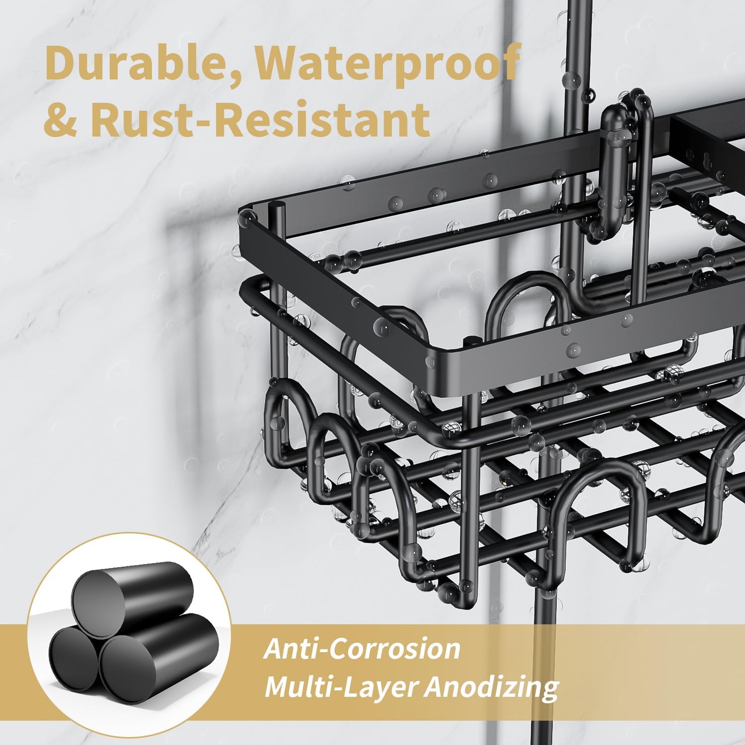Rustproof & Durable – No Swing, No Rust:Crafted from premium stainless steel, this over shower head caddy is rust-resistant and built to last. An included adhesive stickers keeps the shower rack stable—unlike flimsy plastic alternatives that shake or fall