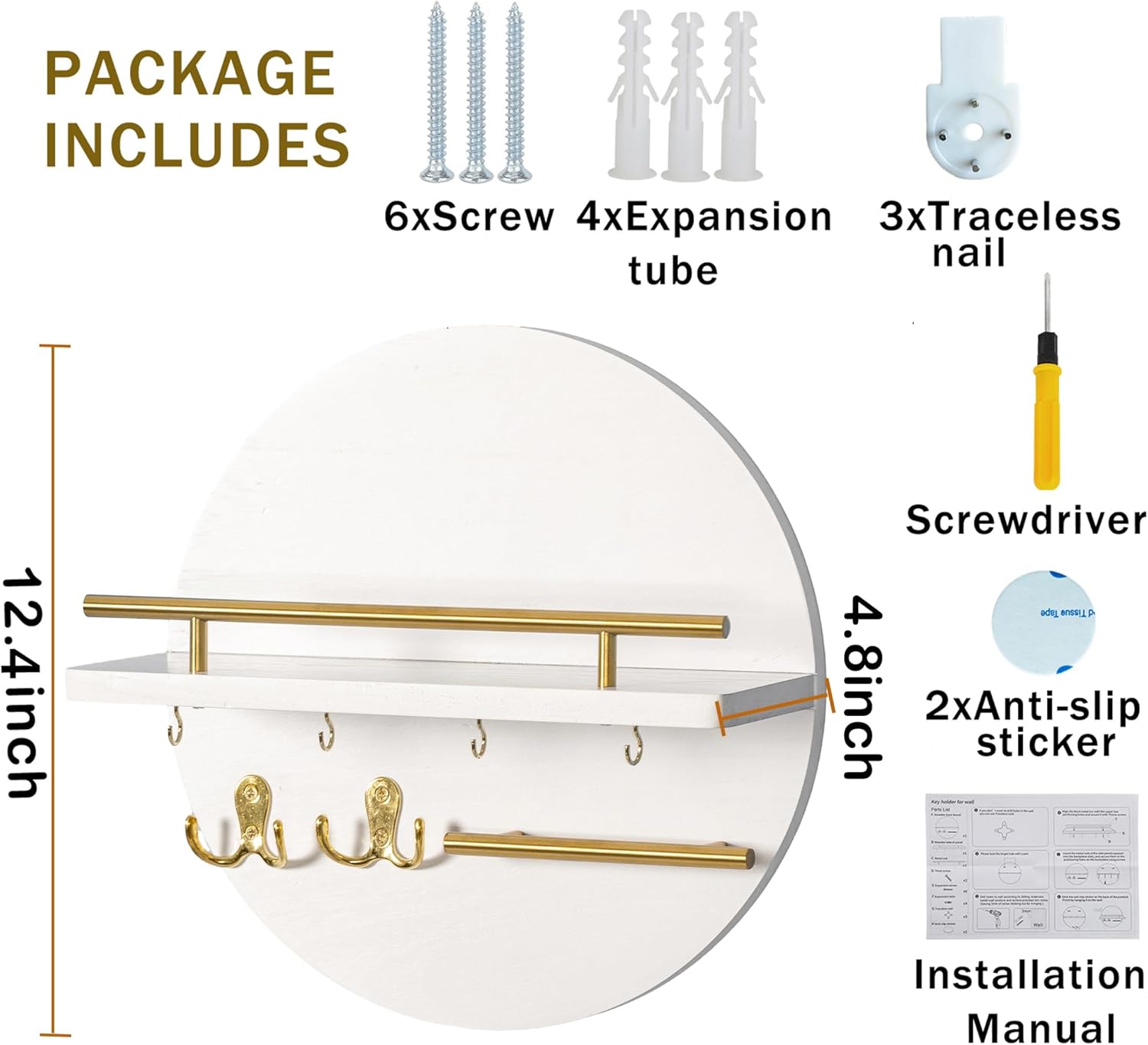 Key Holder for Wall Decorative with Shelf and Hooks, Mail Organizer Wall Mount with Sunglasses Holder, Circular Design Entryway Key Rack Hanger, Rustic Home Decor Boho Wall Decor (White)