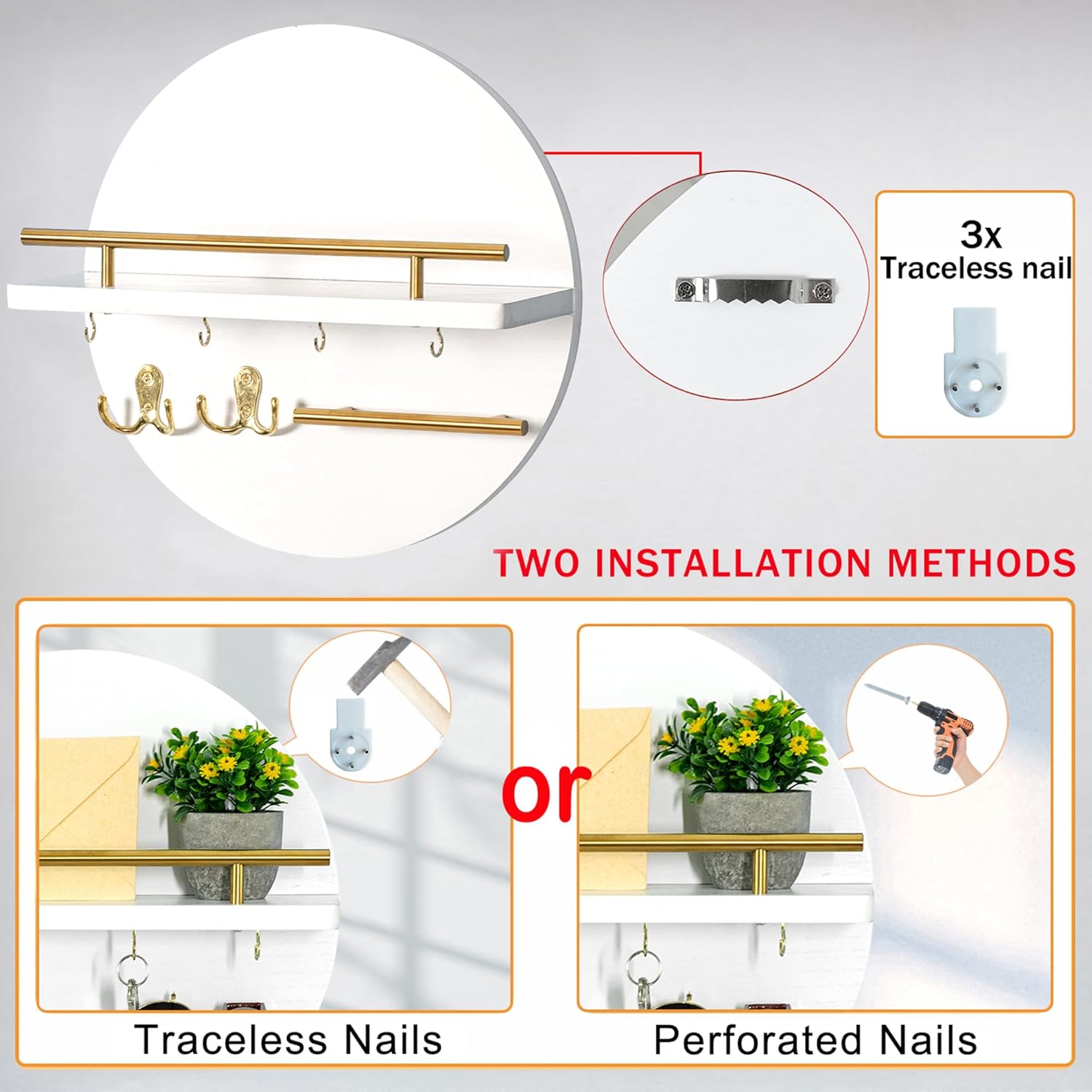 EASY TO INSTALL KEY HANGER: The wall decorative key holder comes with drywall anchors, screws, traceless nails, screwdriver, instruction manual and other installation accessories. Everything comes pre-installed except for the small shelf and the metal Guardrail above it. If you don’t want to drill holes in the wall, you can install it with traceless nails, which can support 20 pounds of weight