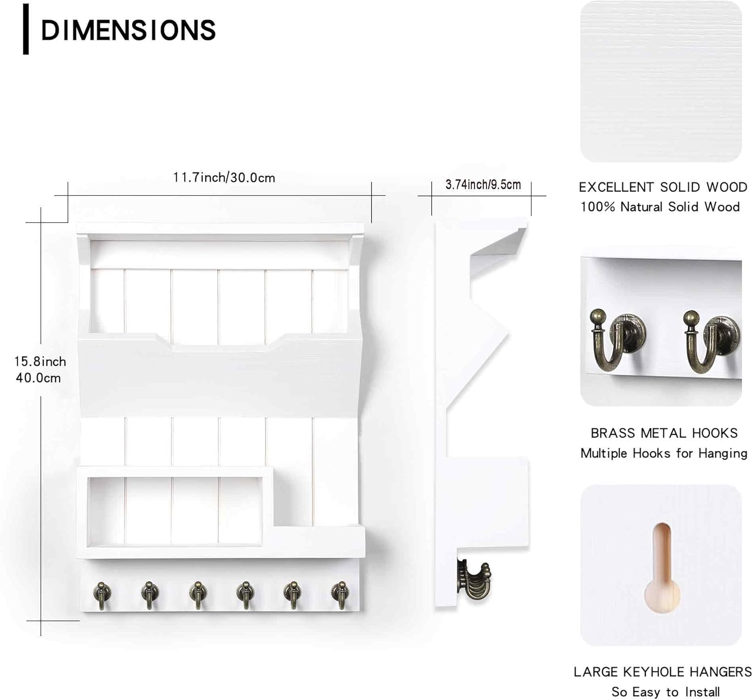 Key Holder for Wall, Mail Organizer Wall Mounted, Mail and Key Holder with 6 Key Hooks for Home Decor, Pine Wood White