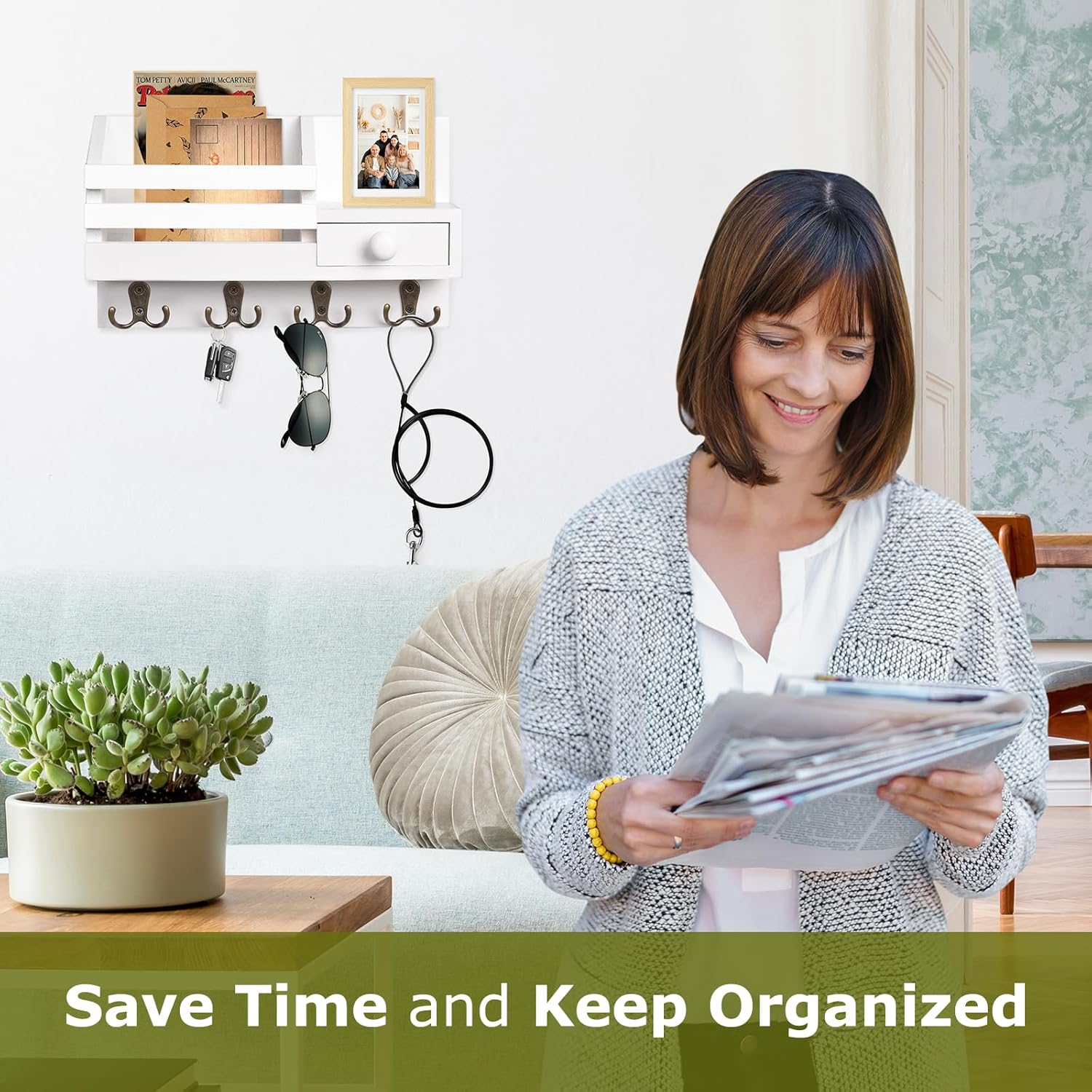 Multifunctional Organizer: Mail and key organizer contains 4 double key hooks, total 8 hooks can meet the hanging needs of the family’s keys; mail slot can store mails that are being sent or received; little drawer is easy to pull off, can hold stamps and spare batteries; the countertop shelf is suitable for a cute little green plant; keep everything in nice order