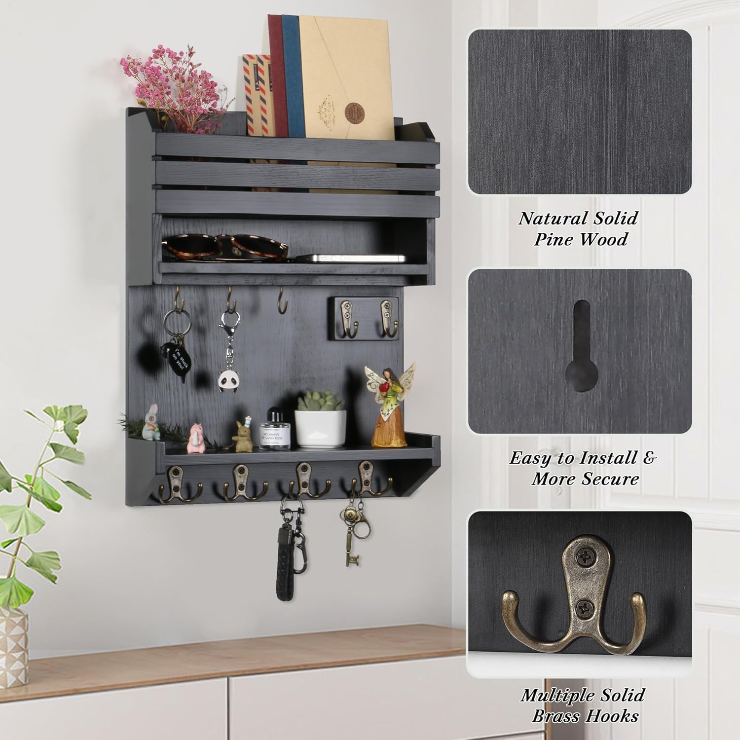 MULTIFUNCTIONAL STORAGE: Wall-mounted key and mail holder make the most of your wall space, keep your home and office simple and tidy. It is perfect for storing mails, keys, anyards, dog leashes, sunglasses, bags, hats, etc.