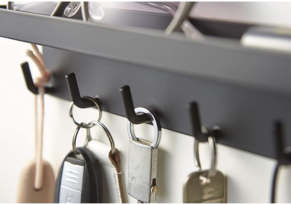 Crafted with a durable black finish, it features a long tray to hold your keys and six sturdy hooks to hang items like mail, sunglasses, or small bags.