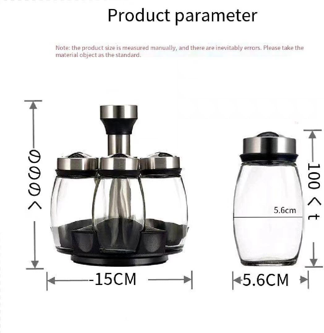 Material: The spice bottle set consists of 6 glass bottles and 1 stainless steel rack. The spice bottles are made of food-grade lead-free glass with transparent body for clear vision. The rotating rack and lid are made of stainless steel, and the base is made of ABS plastic for durability