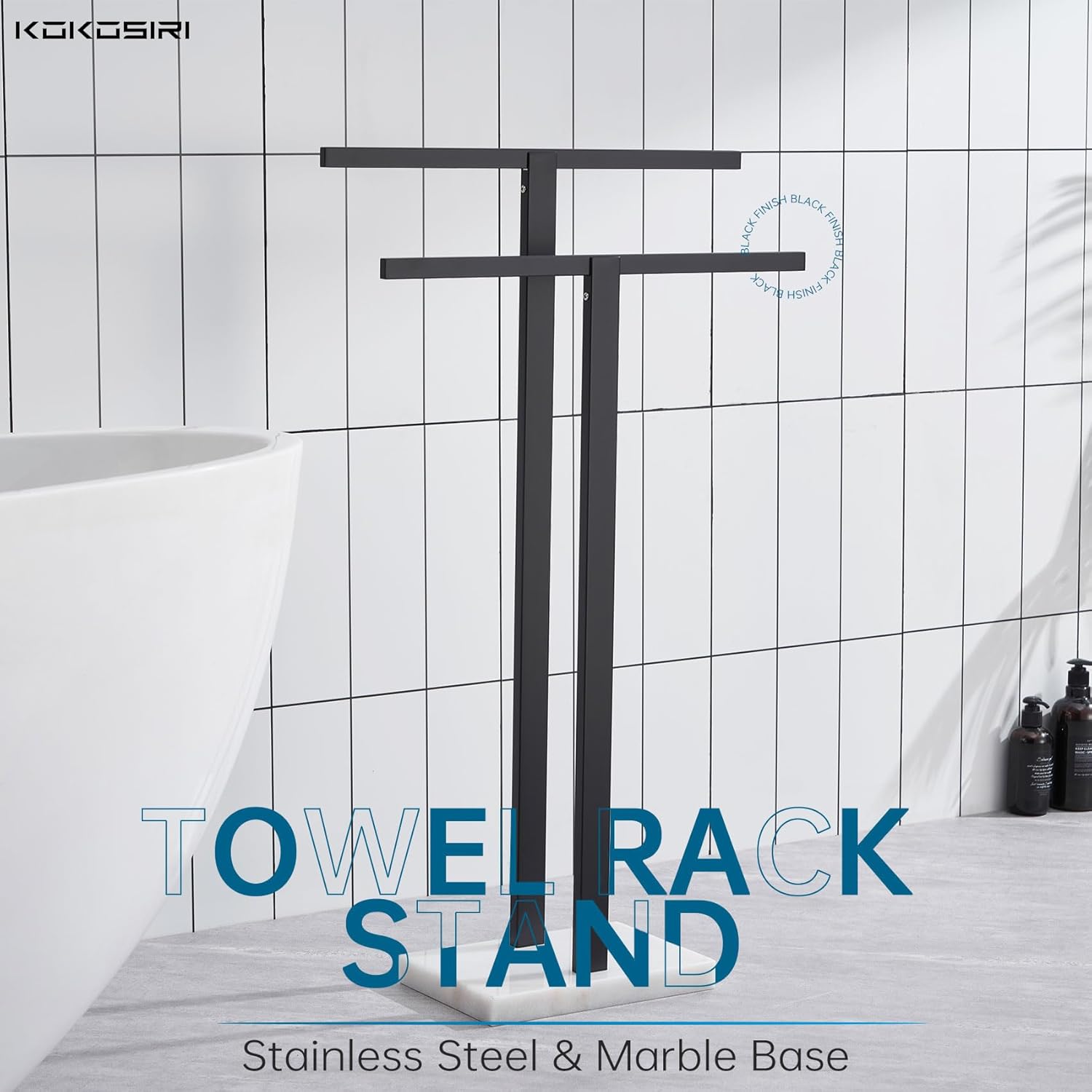 KOKOSIRI Bathroom Towel Racks 2-Tier Standing Towel Bars with Marble Base, Stainless Steel Freestanding Towels Holder, Thicken Steady Design, Matte Black THS0003-BK