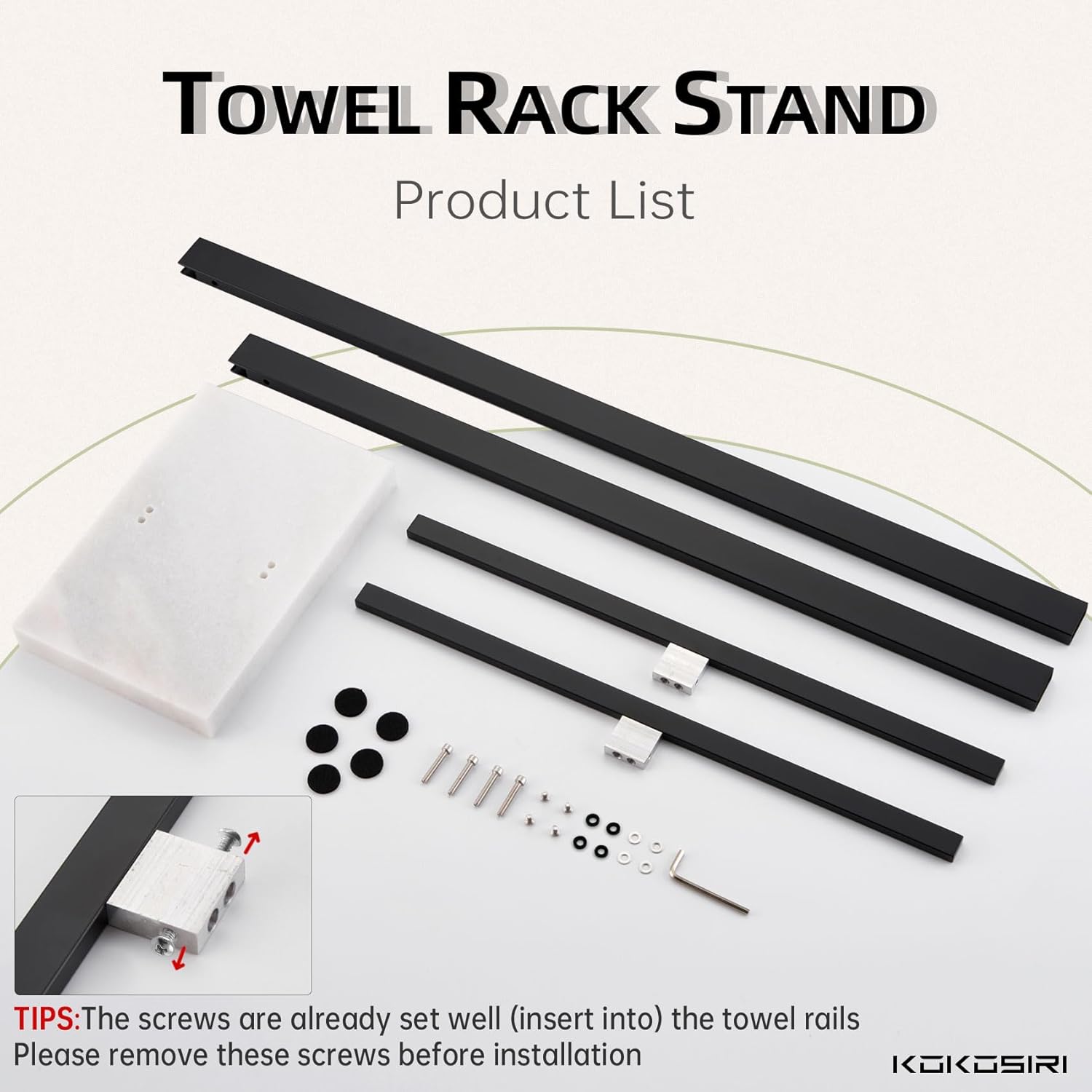 ◄ EASY TO ASSEMBLE ► No Drill Needed! Hassle-free installation. Just place the marble base in the flat floor, then put the T-shape towel bars on the marble base and screw them together in the bottom of the marble base. The Package included towel rail x 2, marble base x 1, circular pads x 5, screw pack and hex wrench. You can enjoy the easy DIY and finish it in 10 minutes