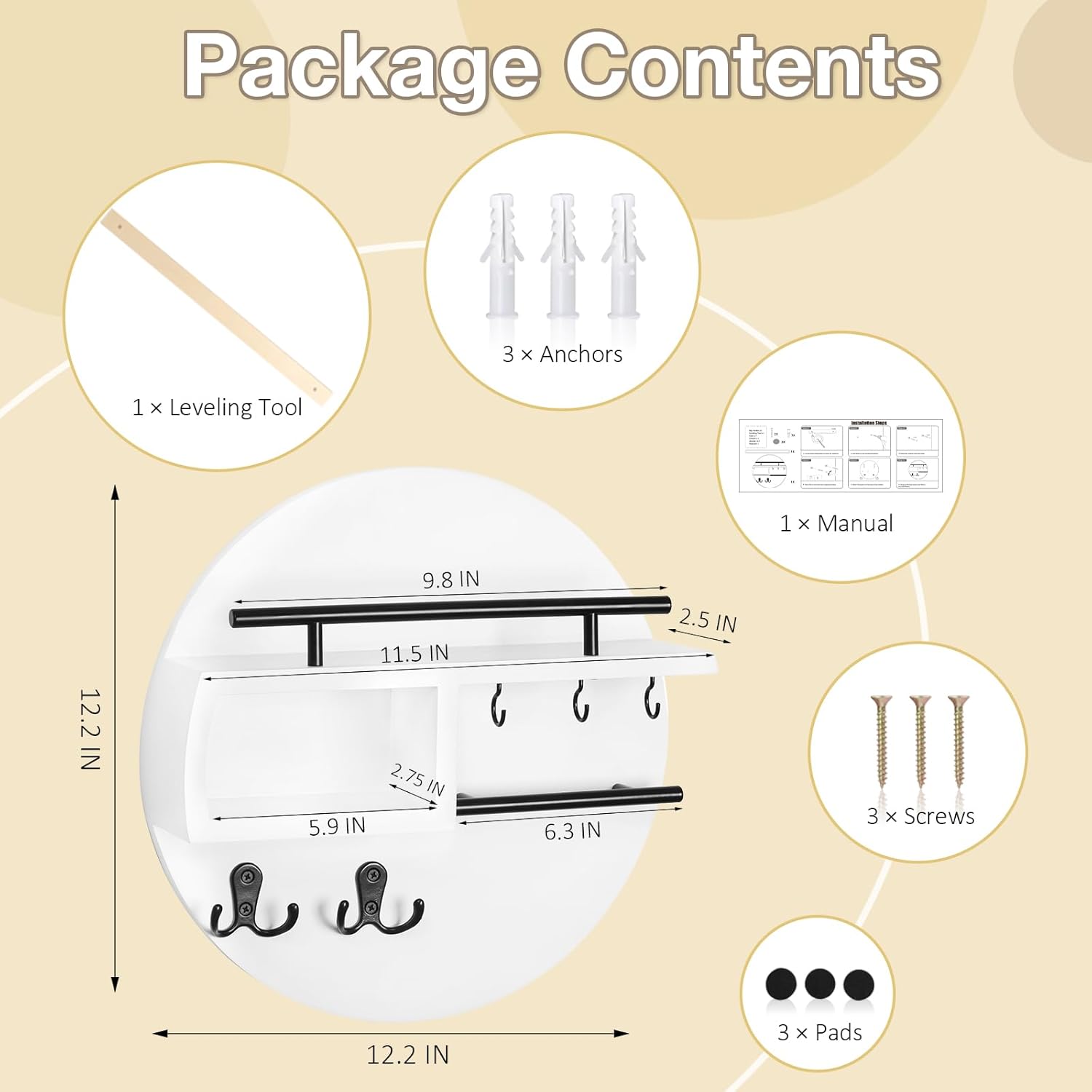 kuaima Key Holder Wall Mount, Round Wooden Key Rack with Shelf, Sunglasses Hanger, Storage Box, Multi Hooks, 12 Inch, White and Black