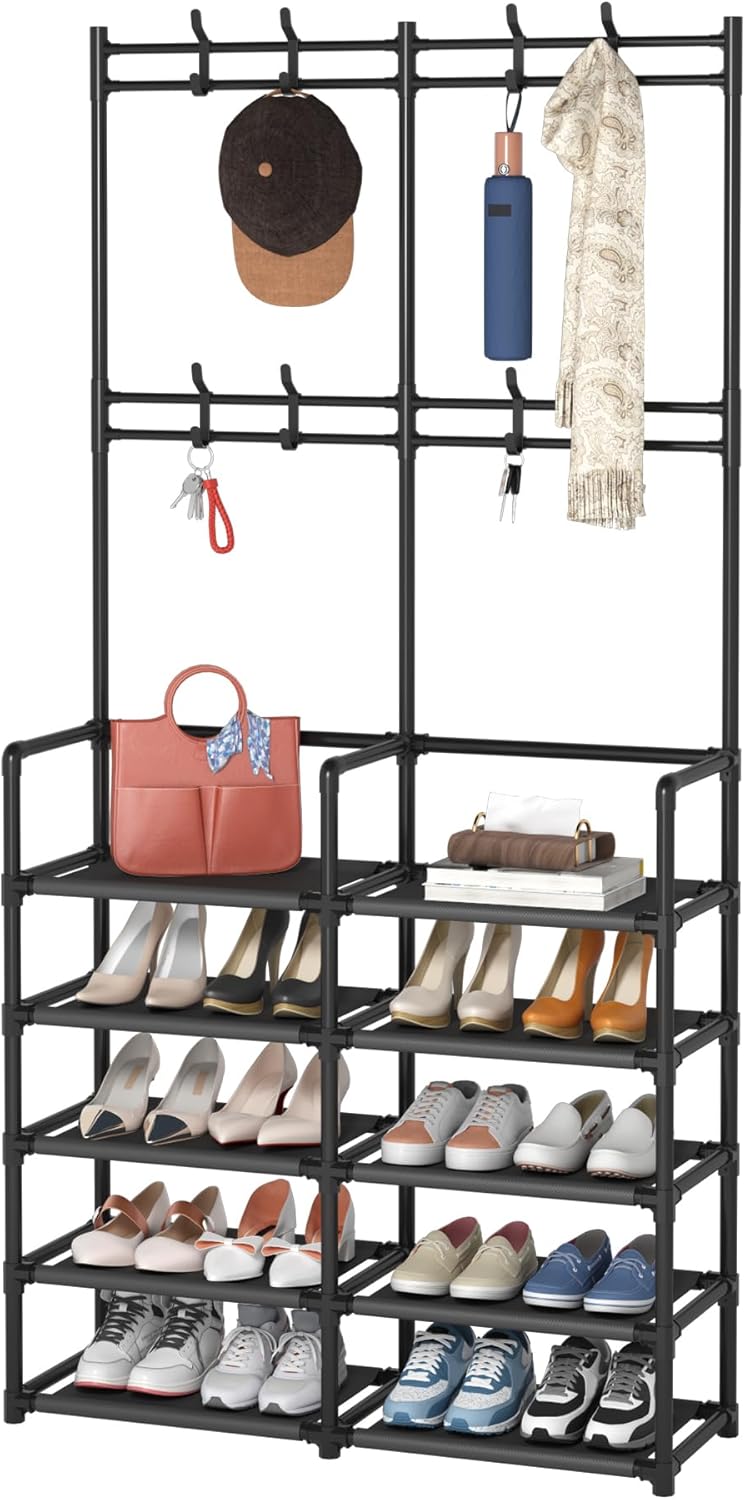 [Multi-function]-8 hooks at the top for storing backpack, umbrellas, keys, scarf, etc. The bottom 10 shelves are used to store your shoes, up to 20 pairs of shoes.