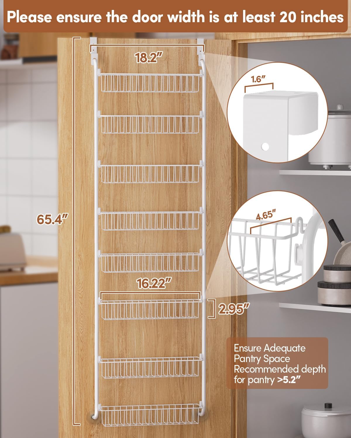 Note: Please make sure to check the size to ensure that the door can close when you purchase this pantry door organizer! Recommended depth for the pantry >5.2 in, door thickness <1.6", door gap >1.5mm, door width of the door at least 18.2 inches excluding the handle
