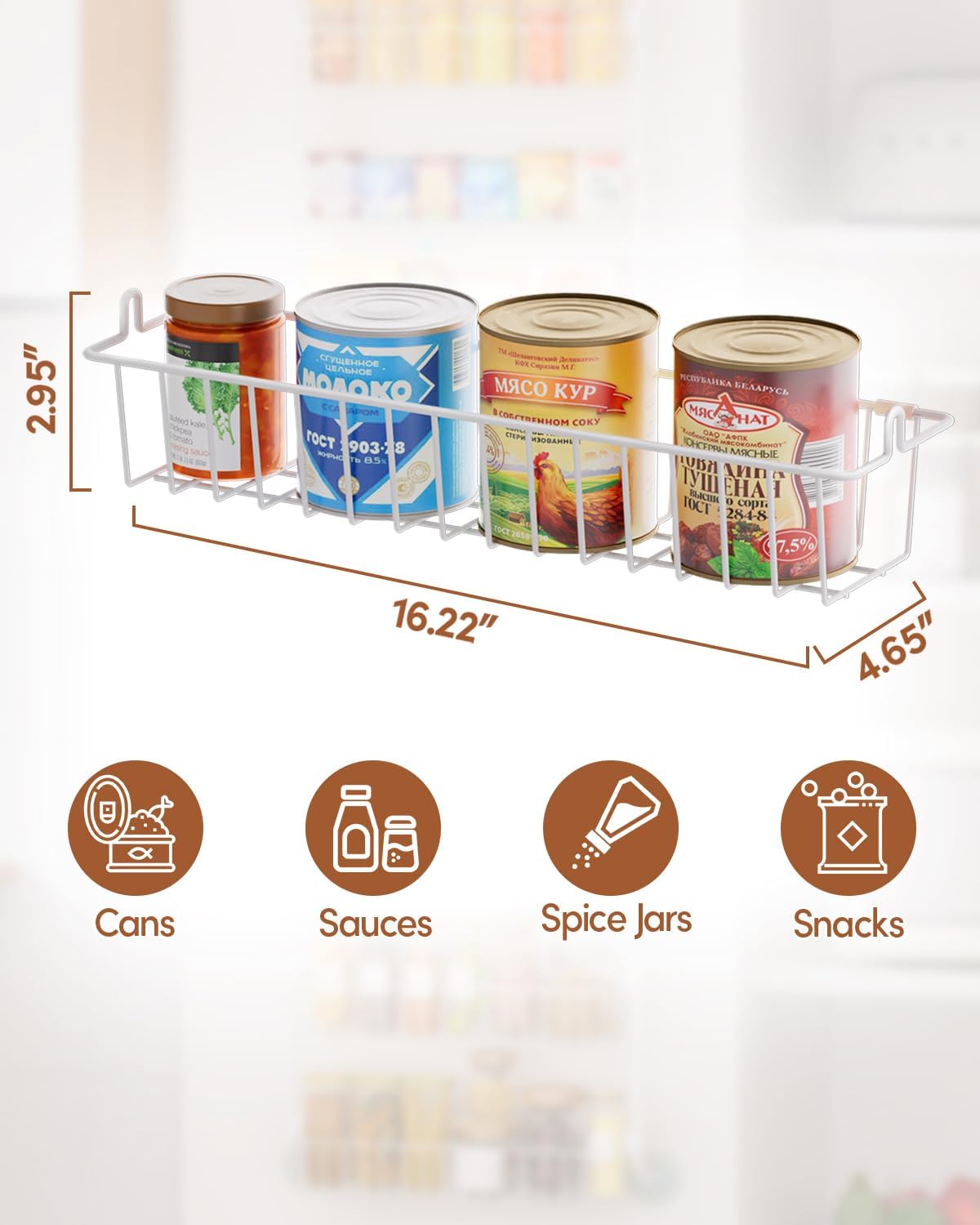 Removable Baskets: Designed for versatility, this pantry organizers and storage feature removable baskets (each measuring 16.22″W x 4.65″D x 2.95″H). Perfect for storing spices, snacks, jars, and other essentials, allowing you to customize the setup based on your needs