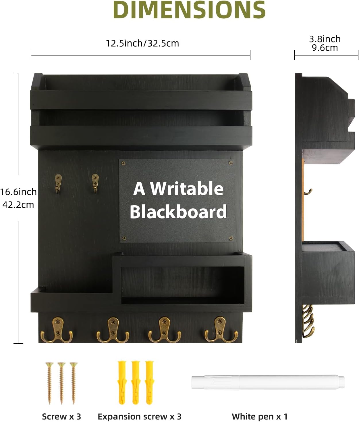 Using high-quality wood and hooks, sturdy and durableComes with a small blackboard and white write penDouble small tray design, beautiful placement of items, not easy to fall offTop large mailbox storage box, accommodating long envelopesSide hooks can be used to hang pendant decorations