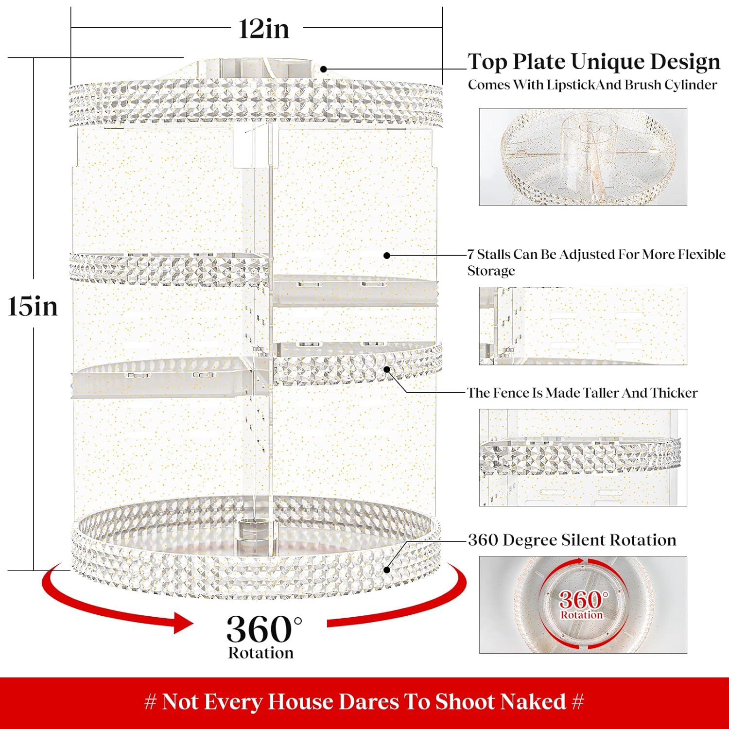 ✅【𝐋𝐚𝐫𝐠𝐞 𝐂𝐚𝐩𝐚𝐜𝐢𝐭𝐲 𝐒𝐩𝐚𝐜𝐞】The X-Large makeup organizer has been designed with a thickening process to become more durable and not easily damaged. The content of the picture shows more than 70 pcs: 30 skincare products, 20 lipsticks, 23 perfumes, 10 Eyebrow Pen, and 7 makeup brushes, saving 70% space for you. Overall Size: 12 x 12 x 15 inches. DEAR, WE ARE ABOUT TO RELEASE A BRAND NEW 360 MAKEUP ROTATING ORGANIZER; WITH MORE SPACE, MORE STORAGE PRODUCTS, AND COMPREHENSIVE FUNCTIONS; PLEASE PAY ATTENTION!!!