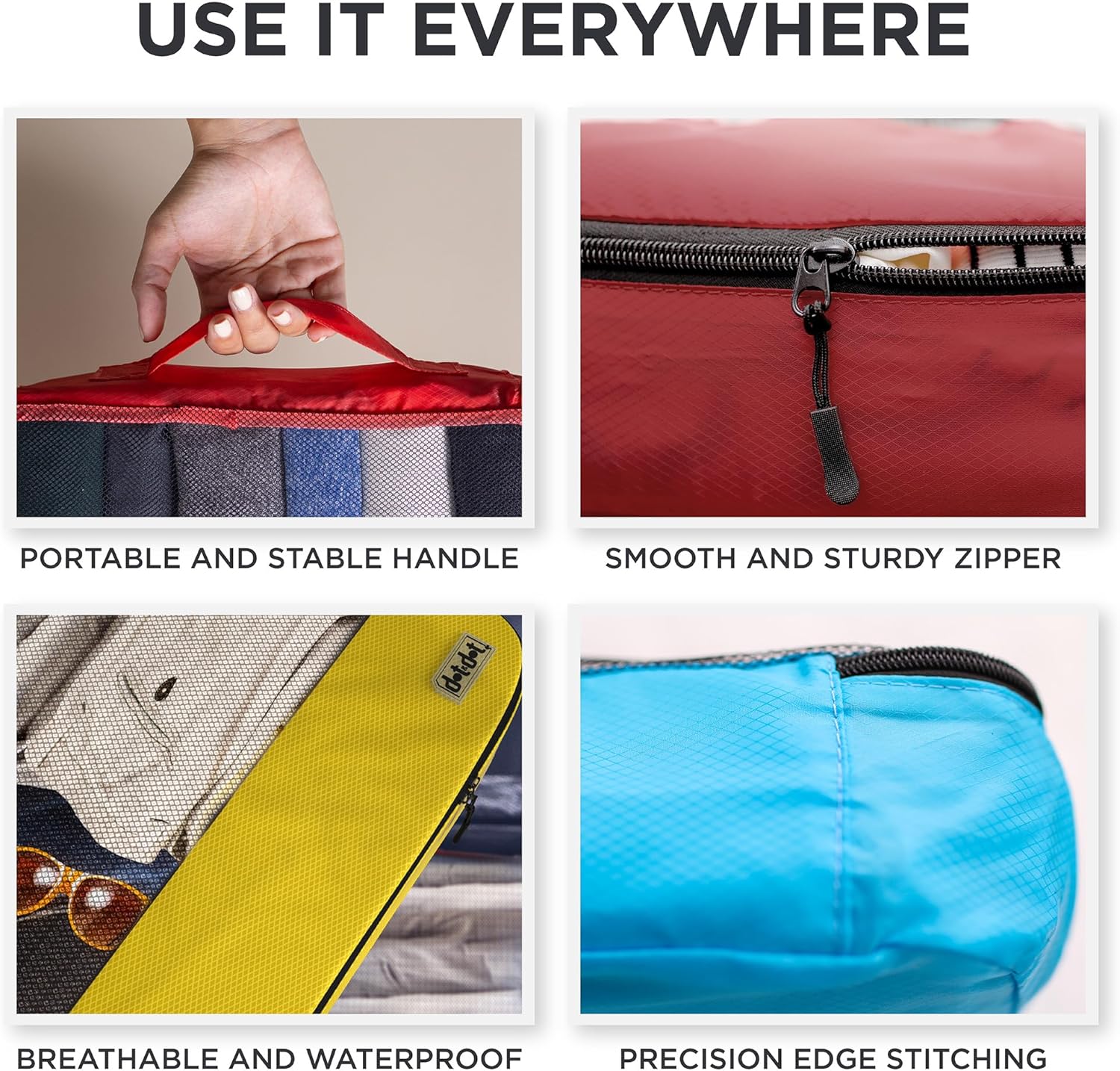 𝗦𝗮𝘃𝗲𝘀 𝗬𝗼𝘂 𝗧𝗶𝗺𝗲 𝗮𝗻𝗱 𝗠𝗮𝘅𝗶𝗺𝗶𝘇𝗲𝘀 𝗟𝘂𝗴𝗴𝗮𝗴𝗲 𝗦𝗽𝗮𝗰𝗲 – Unpacking can be as easy as placing your reusable and durable travel bag organizer into the hotel drawer. Each suitcase organizer compresses the clothes so you are able to pack more clothes in less space.
