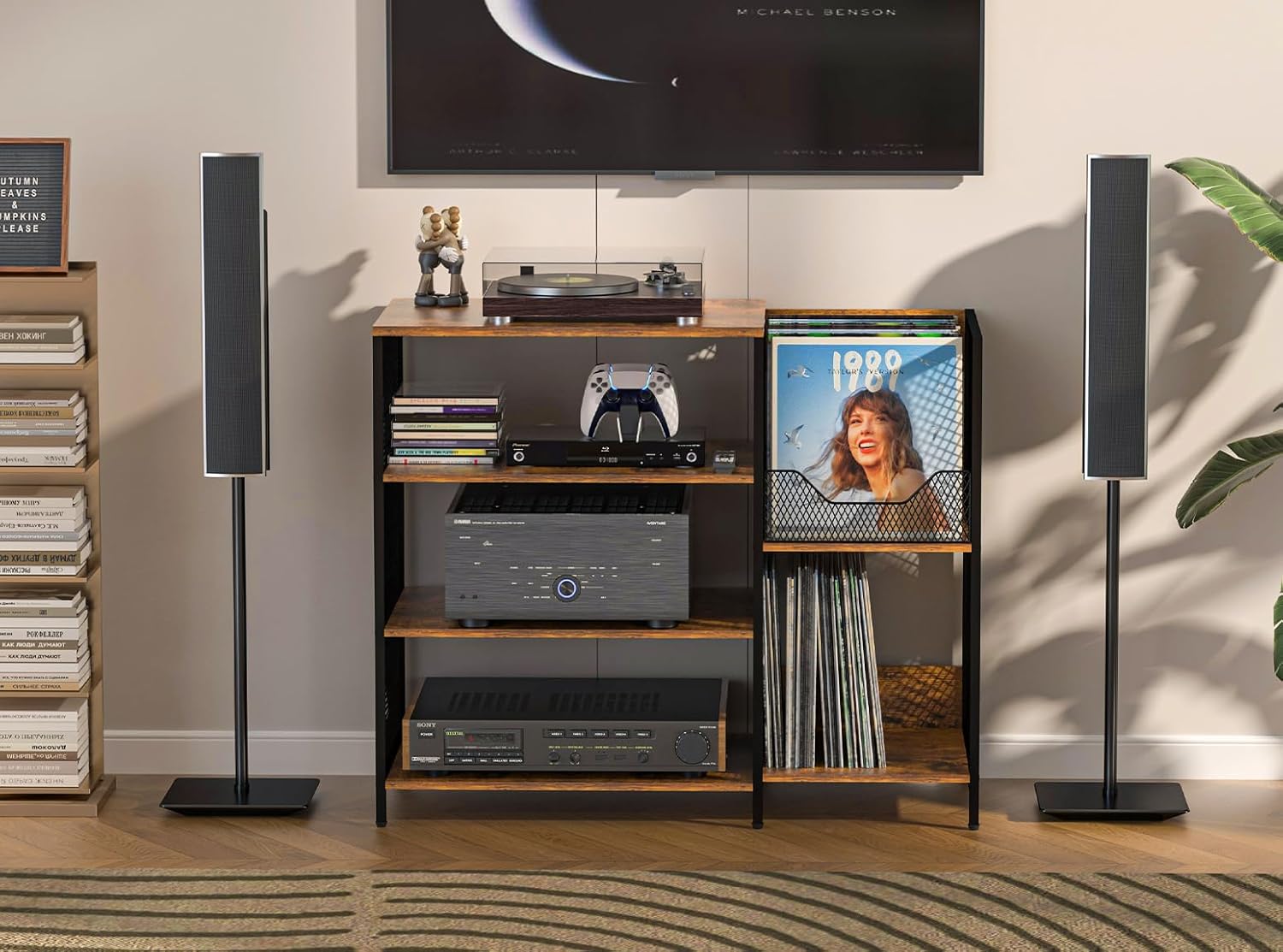 Sturdy metal frame constructure & rustic engineered wood board.Beautiful and Heat dissipation well diamond metal mesh: Top shelf loads up to 150LBS. Other shelves load up to 88LBS.Large worktop: size: 23.6inches *15.7inches.Has vinyl records holders.Can be AV shelving, stereo stand, entertainment center console or a good record player stand.