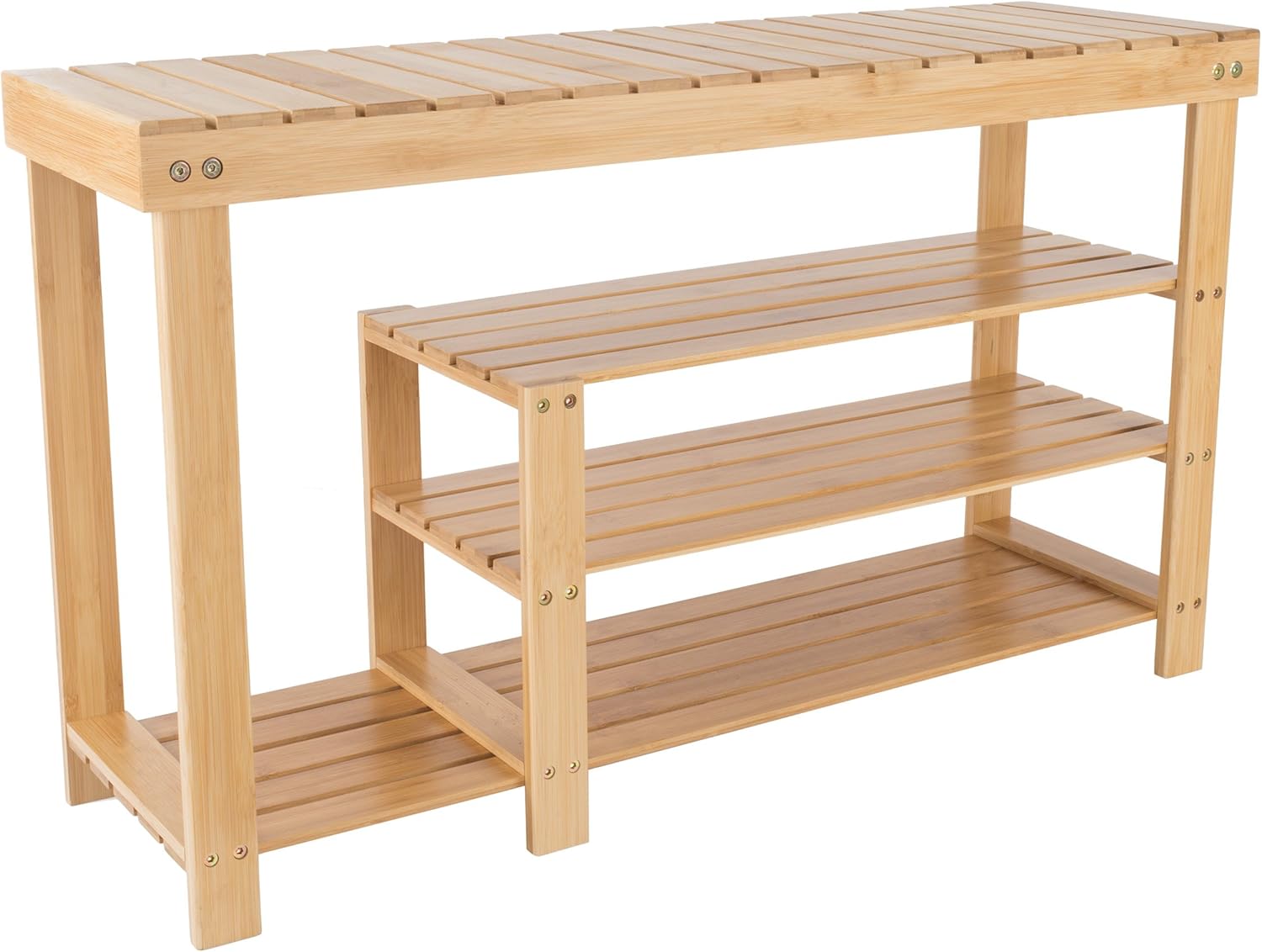 The Shoe Storage Bench by Lavish Home is the perfect organizational solution for any home. With three tiers of shelving for your shoes and one tier for boots, as well as a bench seat top, this shoe storage bench for entryway provides a convenient place to sit and put on your shoes before you head out the door. Constructed from beautiful bamboo, this wooden bench is durable and eco-friendly. The indoor bench is a great space saving option for any house, dorm, or apartment and is an excellent option to keep your entryway, hallway, living room, bedroom, or bathroom neat and clutter free.