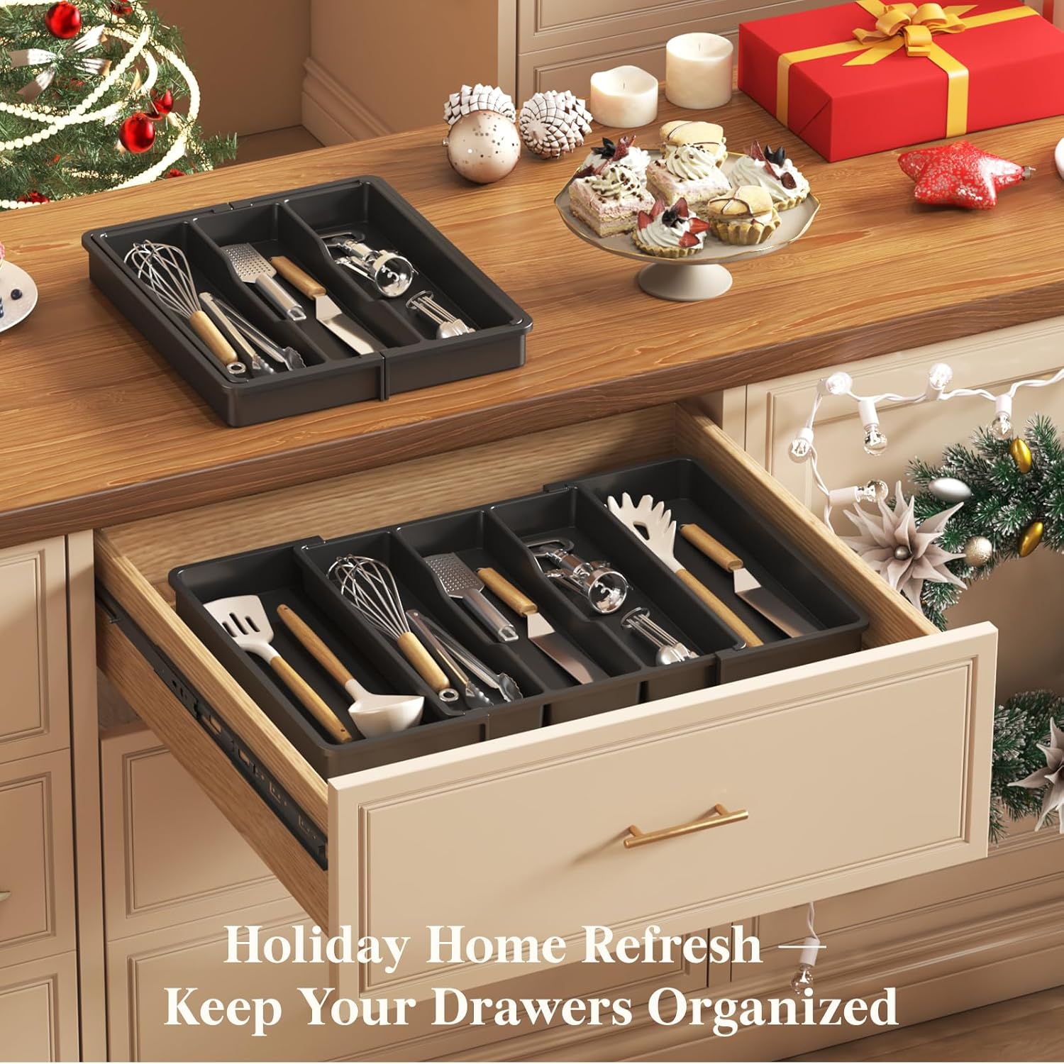 Maximum Organization: Featuring 3 large compartments (13.4″L × 3.5″D) and 2 expandable slots on the side (14″L × 4.7″D), this utensil organizer offers ample space for storing most cooking utensils in the kitchen, such as spatulas, ladles, tongs, utensil sets, and whisks. Please check drawer dimensions before purchase