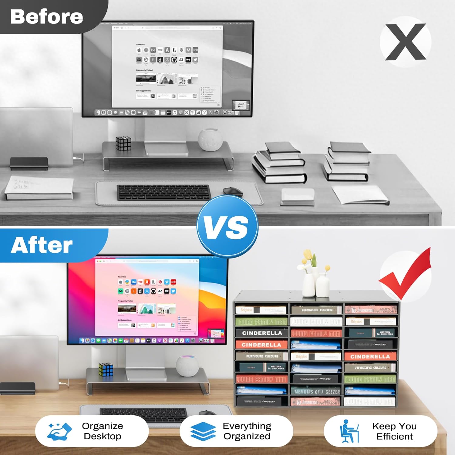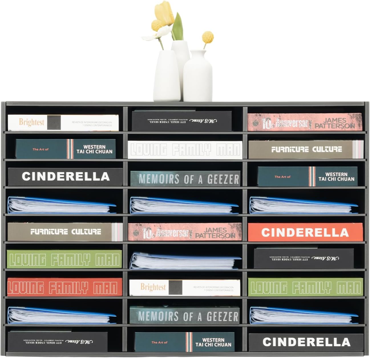 Large Storage Capacity: This literature organizer is large with 27 slots and each slot (10*12*2.3inch) can store about 400 A4 sheets, which can meet your daily storage needs. Meanwhile, you can disassemble the partition boards to place high objects. This can make the space out of clutter and back to a neat and organized state.